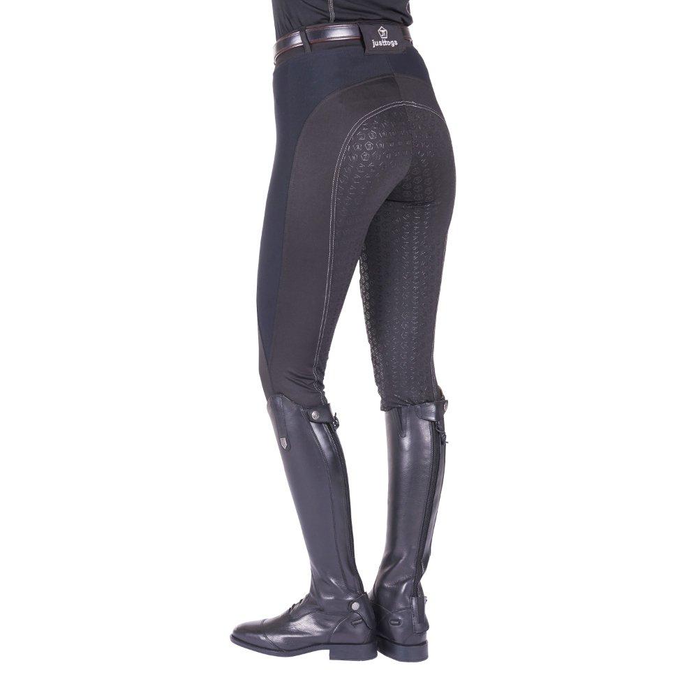 Just Tights have been designed with comfort in mind these super sporty tights feature a full silicone gel seat which covers the knee and a deep waistband for security and comfort in the saddle. The technical fabrics are designed to fit like a second skin. The elegant silicone glitter logo down the thigh is covered by a mesh material for extra durability whilst the side panels give a flattering sculpt to the rider.