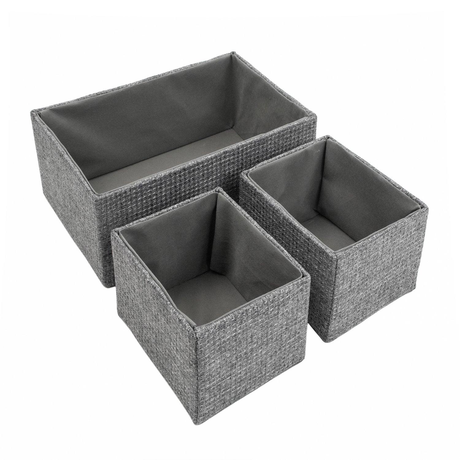 Features: Complete set of 3 rectangular storage baskets to keep your home tidy and clutter free The charcoal grey colour links perfectly with the Scandinavian style interior trend, the dark accent colour is made to stand out Designed to complement most interior décor, elevate your space and can be used around the home to accessorise each room Our fabric storage baskets are so versatile, they make great storage solutions and can be used for a whole host of things Declutter and use them for jewellery, toiletries, stationery, small garments, make up, accessories and more Organise the home and use to store clothing in your drawers or simply a decorative feature in the home An attractive open storage basket that you can use for storing bits and pieces around the home such as in a bedrooms or a range of living spaces. The baskets store inside each other when not in use