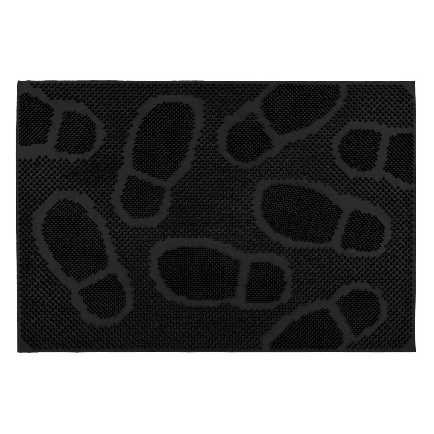 Flexible rubber studs that trap dirt and grit from shoes, while the raised surface gets into the grooves of the sole removing excess mud and dirt, leaving your home clean and tidy The decorative design provides a pleasant greeting for your visitors and designed to complement any entrance The mat is frameless so its easy for wheels to glide over and this allows water to drain away easily Made from rubber, meaning the mat is long lasting and durable making it ideal for a busy home or office Easy to clean, simply shake or hose, practically maintenance free, its great quality and suitable for all weathers, all year round Suitable for outdoor use Size: 40x60cm approx.
