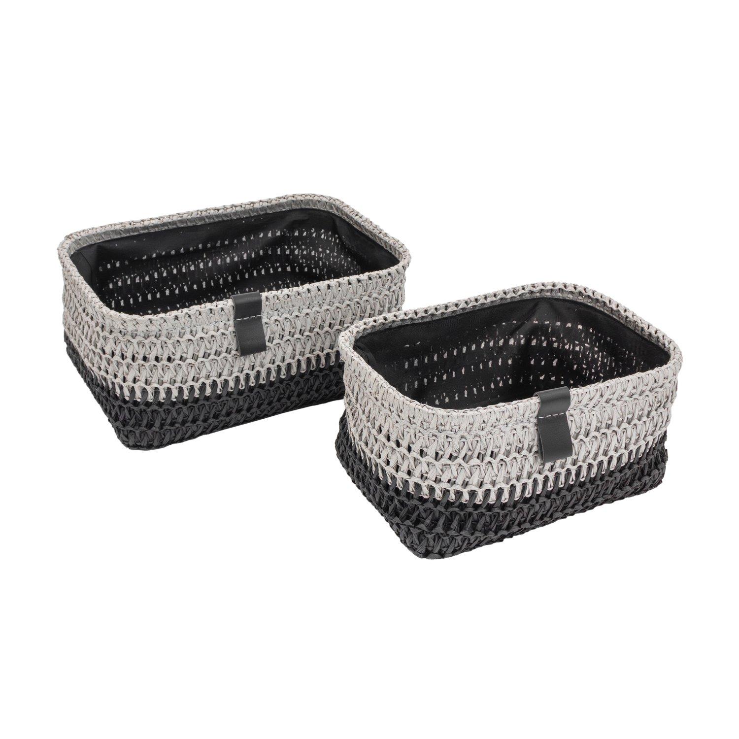 Features: Complete set of 2 rectangular storage baskets to keep your home tidy and clutter free Intricate woven texture that creates a tactile, dimensional surface and an artisanal, handcrafted feel. Creates a contemporary feel with two-colour banding that highlights a bold visual accent, complementing many modern interiors Designed to complement most interior d,cor and can be used around the home Our woven storage baskets are so versatile, they make great storage solutions and can be used for a whole host of things Declutter and use them for jewellery, toiletries, stationery, small garments, make up, baby,s accessories and more Organise the home and use to store clothing in your drawers or simply a decorative feature in the home An attractive open storage basket with stitched faux leather loop detail that adds that finishing touch. They can be used for storing bits and pieces around the home such as in a bedroom, living room, playroom or utility room. The baskets nest inside each other when not in use