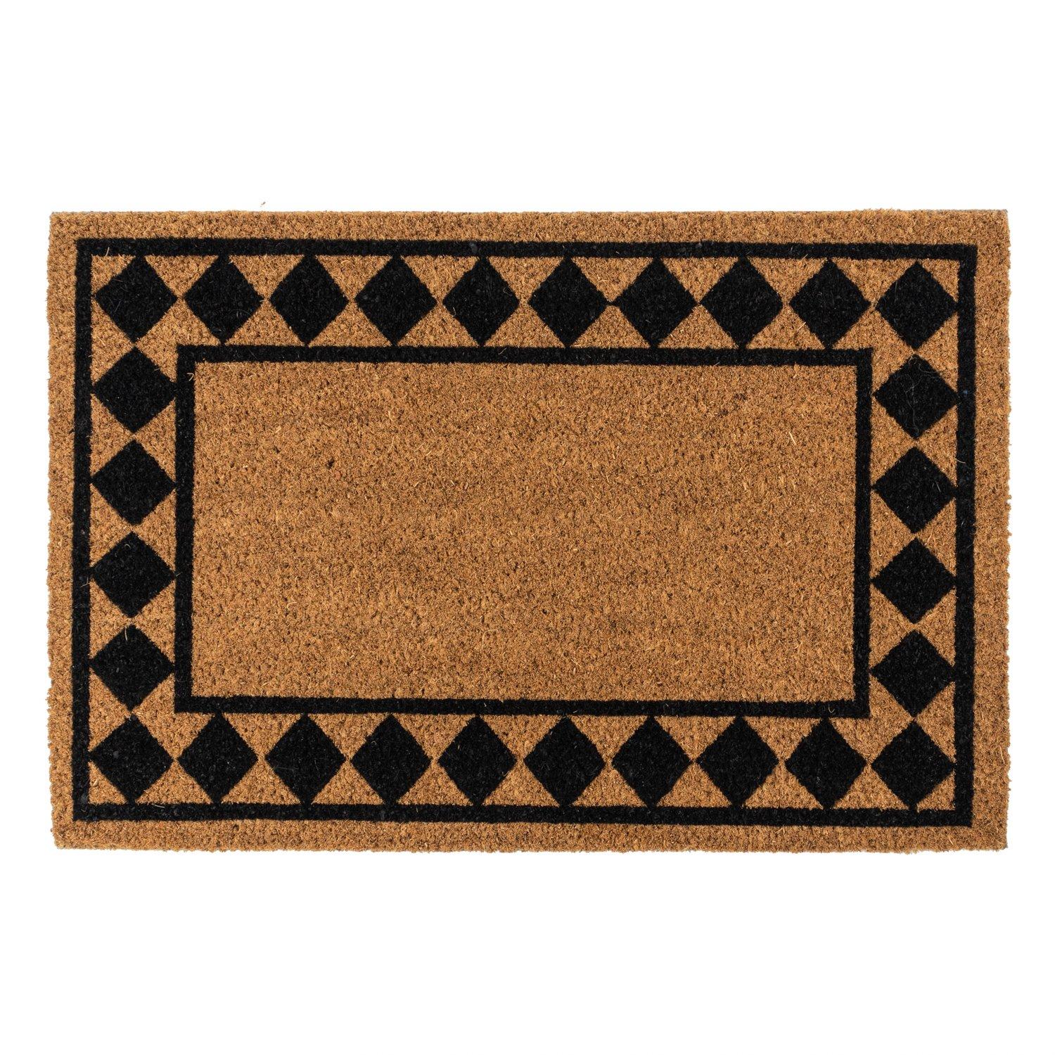 The 'Diamond Border' design is a charming addition to your homes entrance Premium materials, made from 100% coir (coconut fibres) with rubber latex backing The coconut fibres provide a strong surface to trap dirt as you scrape keeping your floor cleaner for longer Our coir is mechanically twisted for less shedding, the coir fibres stay on your mat and not on the floor 15mm pile depth means the coir will deep get into the soles of boots and shoes while the rubber latex backing reduces risk of slipping when wiping your feet 100% environmentally friendly, when the mat comes to the ends of its life and it is ready to be replaced. The coir will disintegrate with one year and the latex compound will disintegrate within five years, subject to soil conditions The coir mat is long lasting and durable making the doormat suitable for use in all weathers Easy to maintain, simply shake or brush to clean Our packaging is renewable too Suitable for indoor and outdoor use Size: 40x60cm approx.