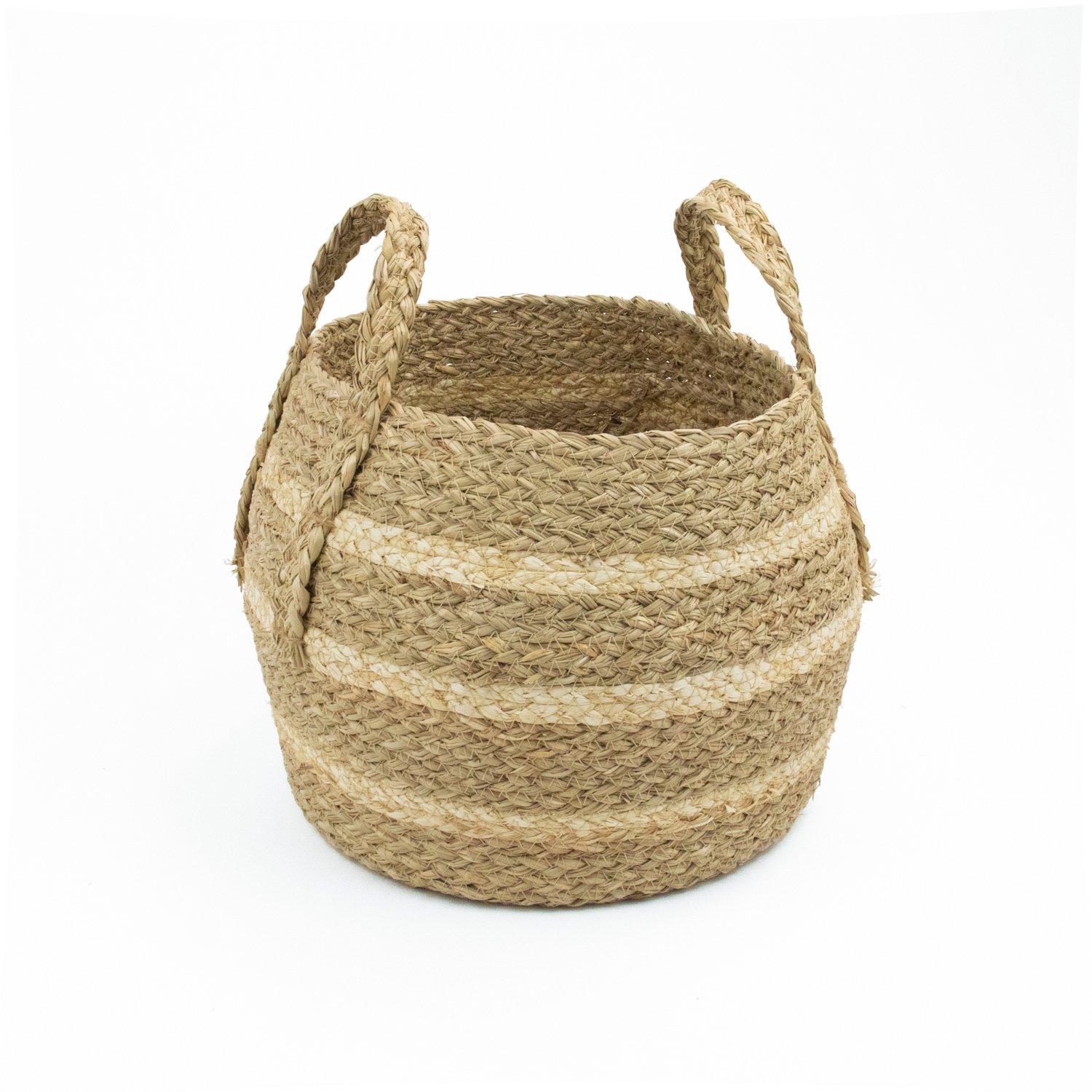 Features: Belly shaped storage basket to keep your home tidy and clutter free Braided straw and maize creates a tactile, dimensional surface and an artisanal, handcrafted feel. Stylish natural two-colour banding that brings warmth and softness to interiors, blending seamlessly with rustic, boho, and neutral décor. Designed to complement most interior design and can be used around the home. Our natural braided storage baskets are so versatile, they make great storage solutions and can be used for a whole host of things Braided handles make lifting and carrying comfortable, practical, and secure. even when the basket is full. Declutter and use them for clothes, laundry toys, baby's accessories and much more. An attractive open storage basket that can be used for storing bits and pieces around the home such as in a bedroom, living spaces, playroom or utility room..