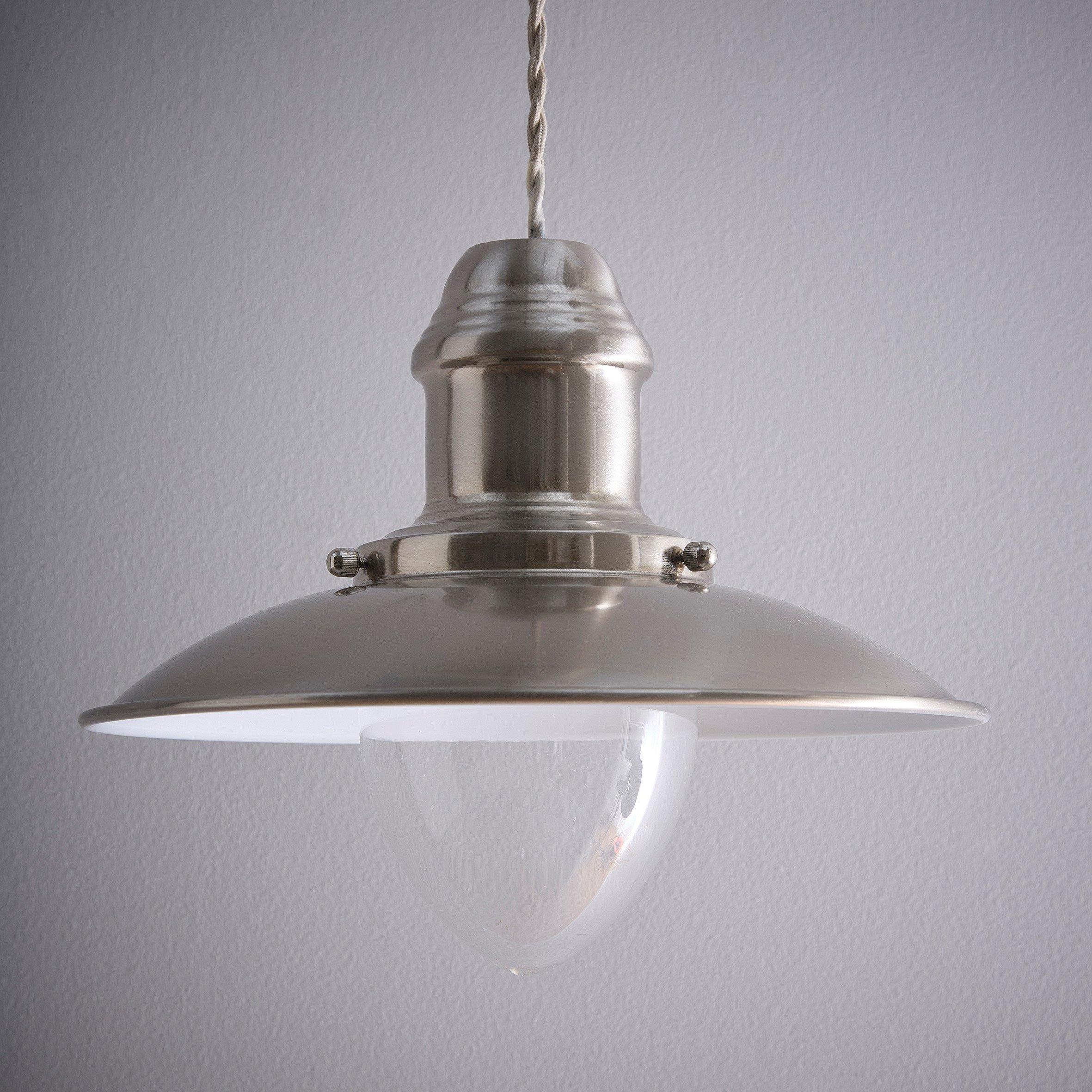 This contemporary industrial style Fisherman's Satin Nickel Light Shade. will certainly create interest to any room. The Pendant shade houses a bulb (not supplied) behind a stylish Glass and Brass cage covering. Floor Lamp available and Table Lamp (sold separately)