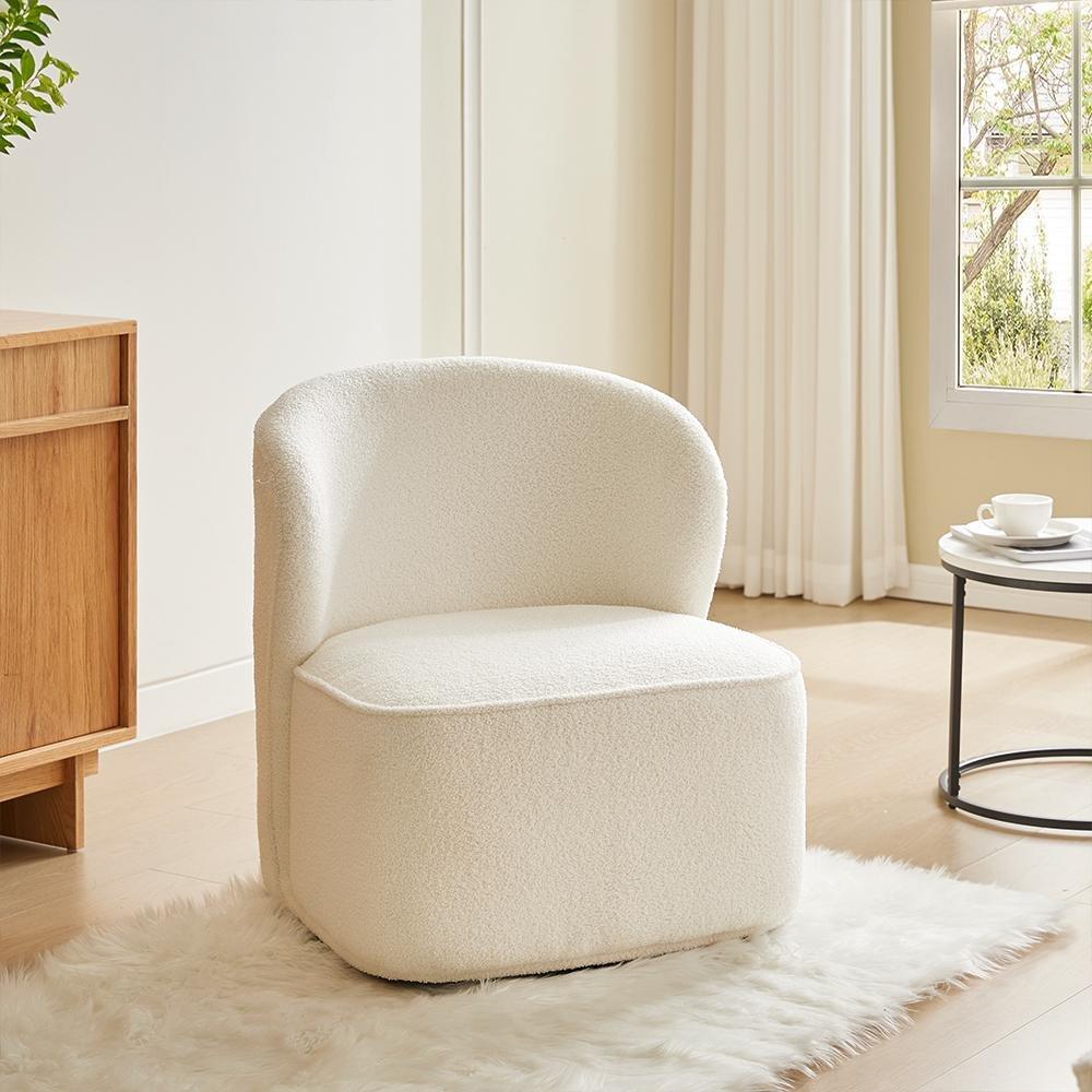 Elevate your relaxation with this exceptional swivel chair adorned in luxurious sherpa. The rich upholstery is not just pleasing to the eye but also wear-resistant. Sink into the generously padded sponge seat cushions, while the inwardly curved backrests provide optimal support for reading or watching TV. Thanks to the bottom ring, you get to enjoy unrestricted freedom with the ability to rotate effortlessly. The neutral colour and clean lines seamlessly blend, making it an unobtrusive addition to your home.