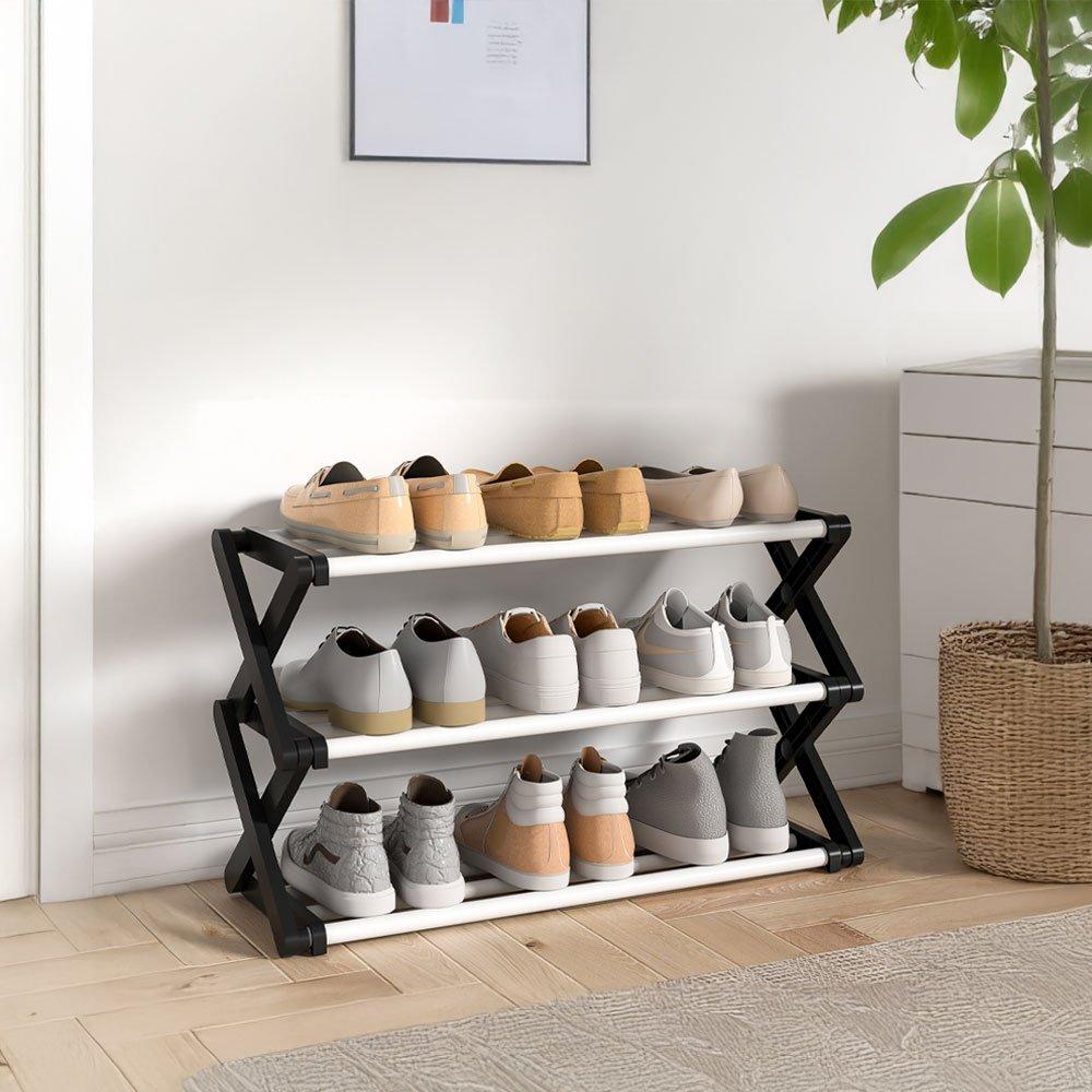 Transform your shoe storage with this innovative shoe organizer. With unique X-shaped side frames and roomy shelves, it holds up to 9 pairs of shoes, accommodating sneakers, flats, heels, and boots. No tools are needed for assembly, making it easy to set up. This stylish rack is a perfect addition to your closet, entryway, or living room.