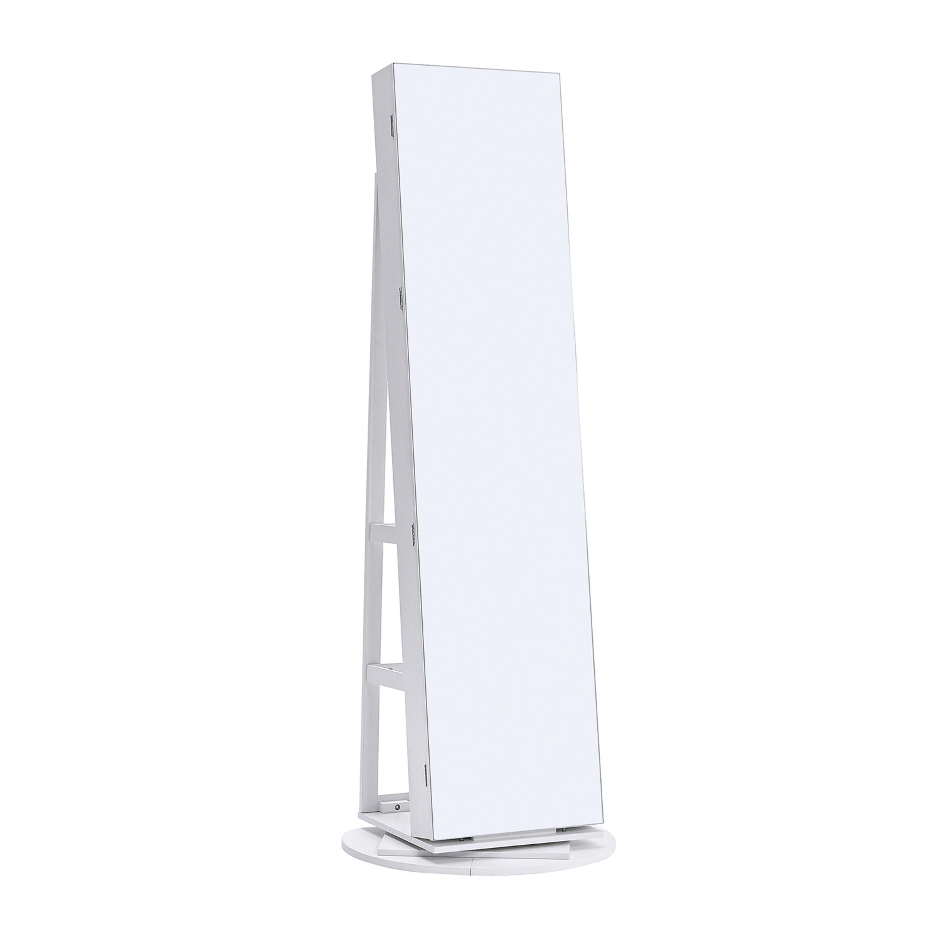 Offering a lot of storage options, this elegant rotating white jewelry armoire is built to impress. Designed with a sleek white finish, it seamlessly blends in with any decor style while providing a convenient and stylish solution for your precious accessories. This cabinet features a built-in mirror and back storage shelves, making it a functional and versatile piece for your bedroom or dressing area. With its rotating design, you can easily access your jewelry from any angle.