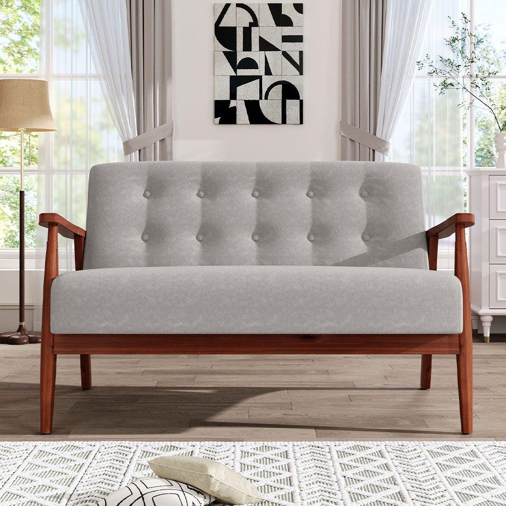 This tufted sofa is an ideal addition to any living room, featuring a classic design with traditional elements. For instance, the subtle tufted detail on the seatback adds an extra layer of depth and visual appeal, paired with the vintage walnut wood frame. The light grey upholstery harmonizes with the wood's finish, creating a neutral accent that blends seamlessly with any decor style. Simultaneously, the thick cushion and sturdy wooden frame work together to offer you a more comfortable sitting experience.