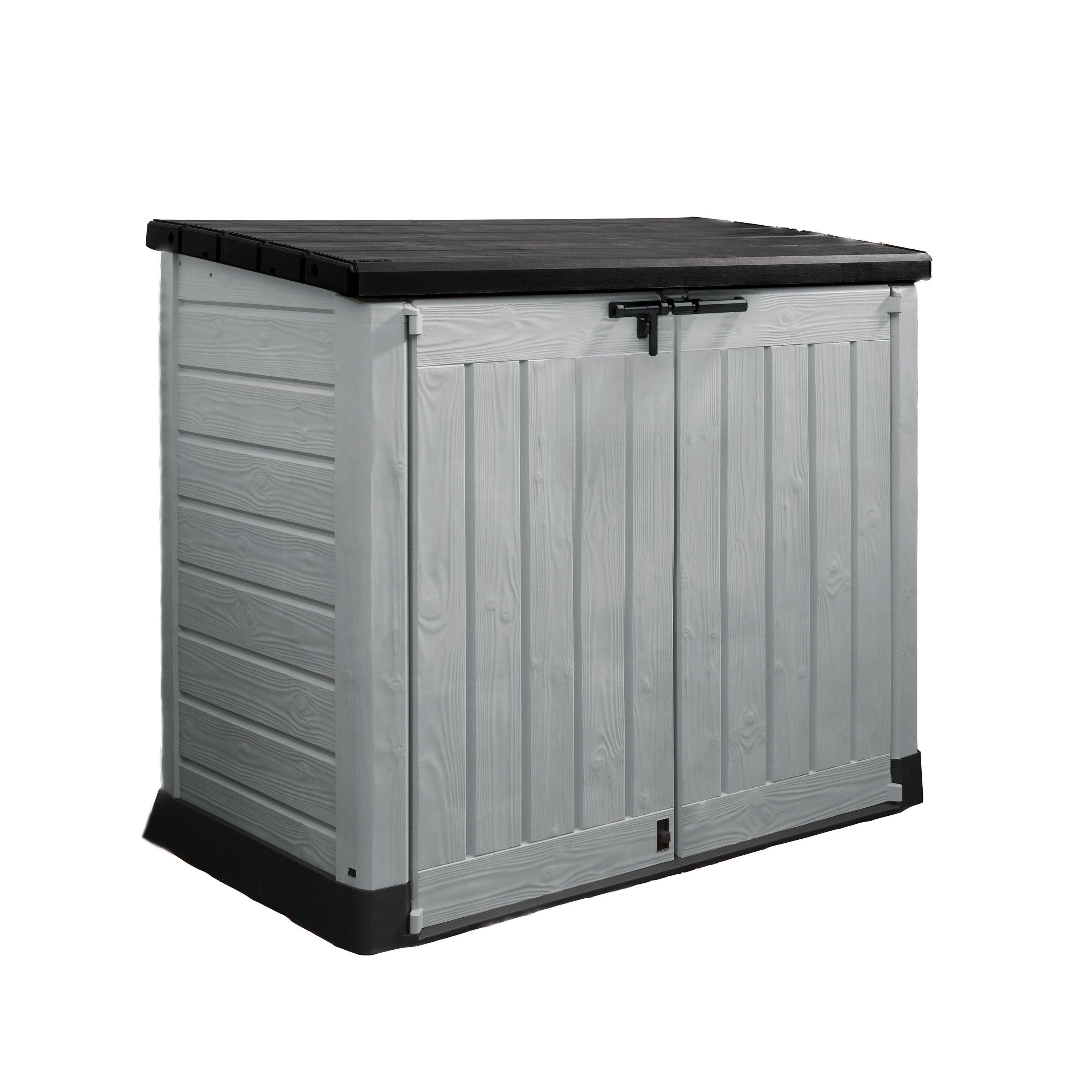 Features and benefits Durable, weather-resistant design - no maintenance or fading Heavy-duty floor with main door bolt and secondary foot bolt for secure closure Ideal outdoor storage solution for garden tools, equipment and x2 240 L wheelie bins Elegant wood affect panels with a piston-assisted lid and wide opening doors and a 1200L capacity