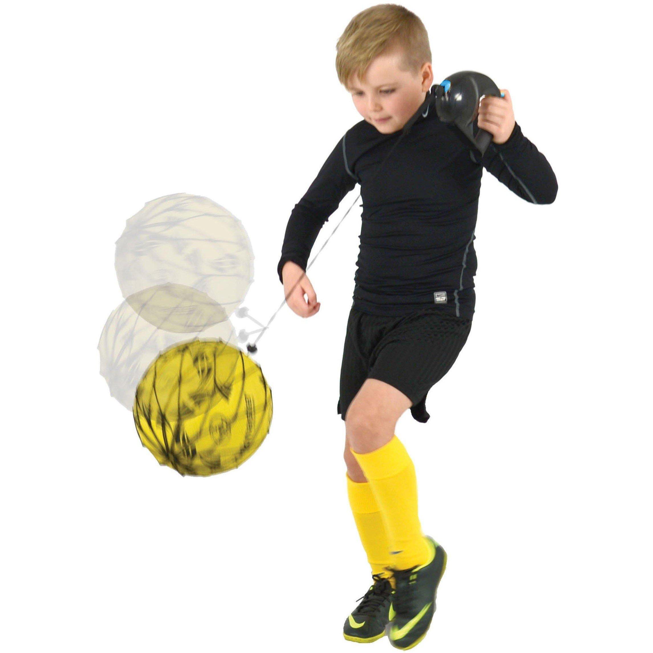 The Kickmaster range of football products is not only perfect for encouraging children to get outside and active but is ideal for honing skills at an early age for any budding players! The Kickmaster Close Control Trainer is the ultimate companion for perfecting ball control early on with it's dual mode for use. During standard use, the cord will extend out in reaction to the kick and then recoil, sending the ball back toward the player for catch and control practice from the rebound. Mode two can be switched on via the instant and secure lock mechanism on the ergonomic handle, which will lock the cord out at a distance of up to 3.5m, removing the recoil motion, making the rebound less predictable. Passing, control, shooting, keepie-uppies, there's not much that this product can't help with and with it's universal net, it can hold balls from sizes 3-5. It's so compact that it can be stored and transported pretty much anywhere! N.B ball is not included The original hand held training device for ball control practice Features responsive recoil mechanism for fast action Instant cord locking mechanism to allow for recoil or set rebound action Ergonomic grip for improved comfort and grip Universal ball holder to fit all standard sized balls (ball not included)