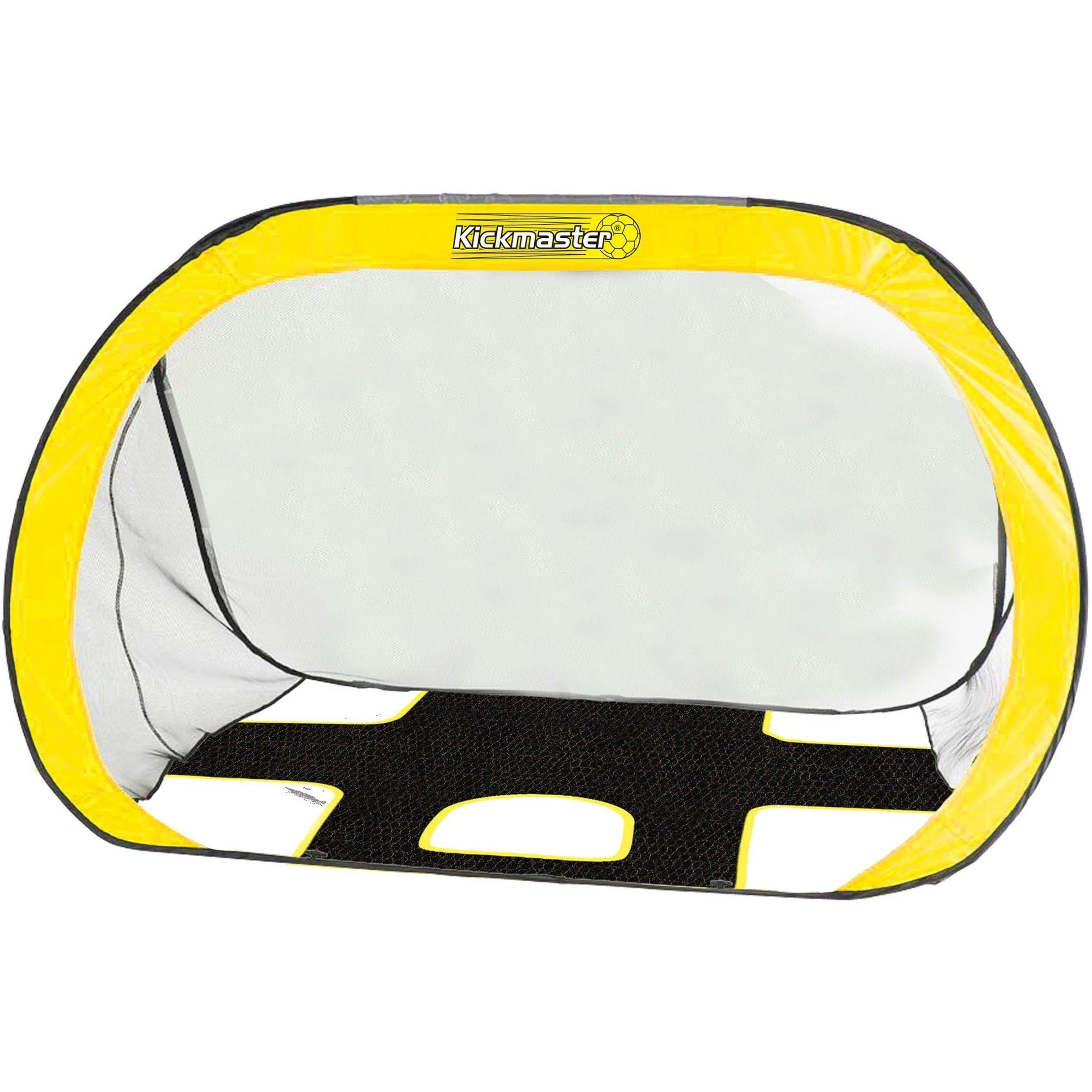 The Kickmaster range of football products is not only perfect for encouraging children to get outside and active but is ideal for honing skills at an early age for any budding players! The Kickmaster Pop-Up Goals and Target Shots are a 2-in-1 product which allows players to switch modes in seconds! On one side, there's a standard goal, perfect for practicing those free kicks and penalties whilst on the other is a target shot ideal for simply perfecting your aim or turn it in to a scoring game with friends or teammates with the printed scoring system! Ground pegs are included for windy days and extra security when firing shots. The pop-up design allows for the product to be ready for use in seconds and folded down just as quickly and it can be simply flipped over for mode change. It comes with a durable carry case for easy storage and transportation so that it can be taken from garden, to park, beach, pretty much anywhere! Football skills combination goal and target shot Pop-up and down assembly Highly portable with carry case Durable design Anchor pegs included for extra stability Built dimensions 105 x 75 x 75cm
