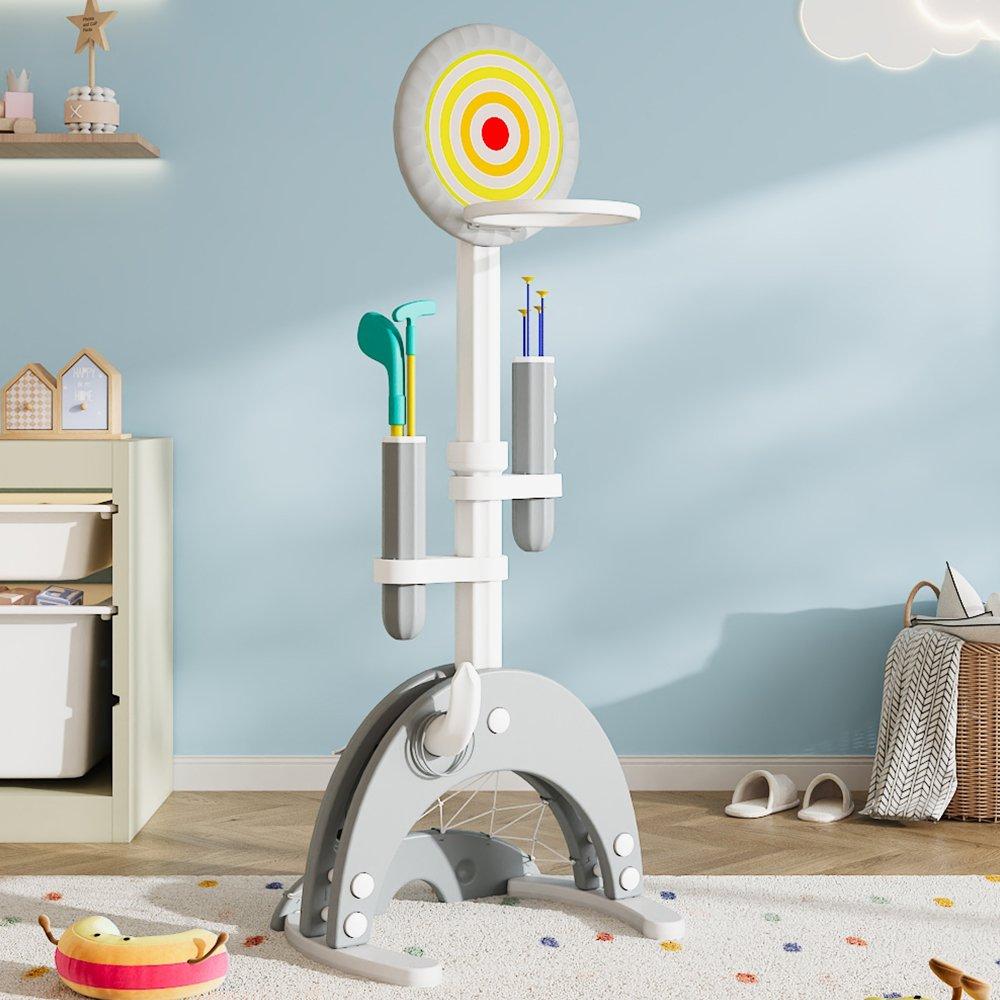 Looking for something that can channel your child's energy and provide ample exercise? This multifunctional basketball hoop set is exactly what you need. Designed to enhance hand-eye coordination and develop sports skills, it incorporates basketball shooting, darts throwing, arrow shooting, goal scoring, golfing along with ring tossing, allowing your little ones to have fun for hours on end. Supported by a stable base, this set ensures safety, making it an ideal companion for endless fun and activity.