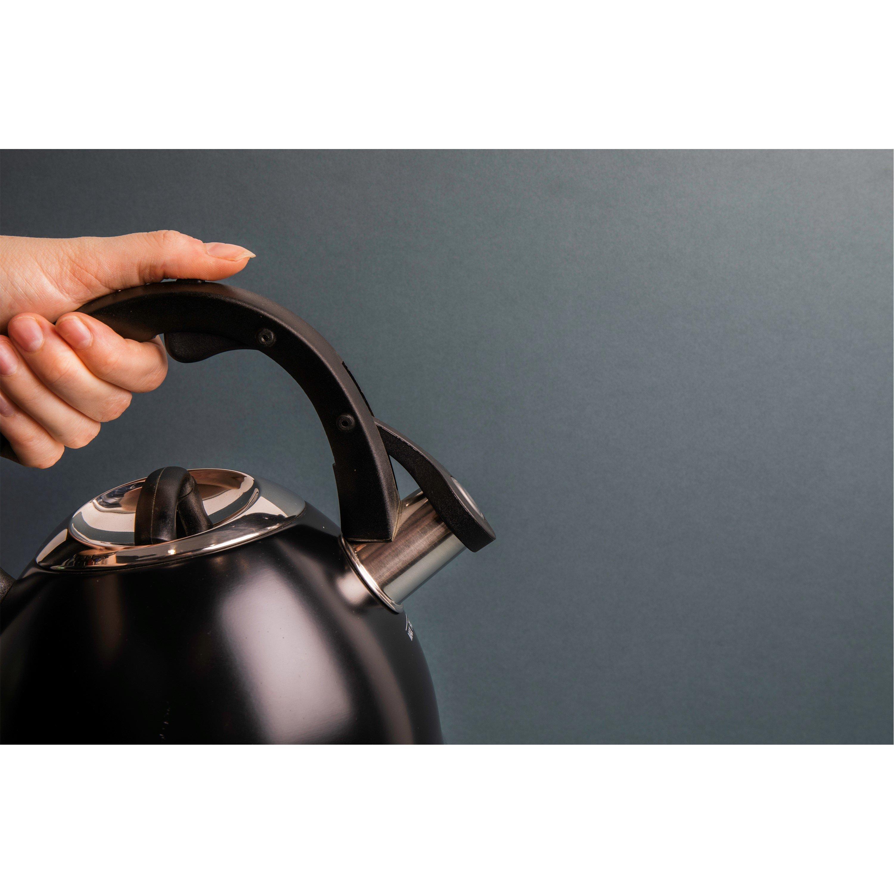 Embrace tea and coffee-making tradition, even if your kitchen's fitted with the height of modern tech. This retro-inspired stovetop whistling kettle works on all hobs - gas, electric or induction. It's ideal for range cookers like AGA stoves too. Wherever you use it, it's bound to catch some admiring looks. Its curvaceous shape and gloss black finish will boost the charm factor of any kitchen, whether it's cool and contemporary or cosy and traditional. Of course, it has a built-in whistle too, so you'll hear that charming peep when your water's boiled. When you're ready to pour, simply flip the whistle up and enjoy another piping-hot cup of the good stuff. Like all La Cafetière products, this induction hob kettle is built to last. It features a robust steel core, finished with a tough vitreous enamel coating. For extra comfort, it features a stay-cool plastic knob and handle. Need a present for a tea or coffee lover? This enamel stovetop kettle comes in a handsome La Cafetière box, so it's great for gifting. Three colours are available: black, red and cream. This listing is for a black whistling tea kettle with a handy removable lid. Capacity: 2.4 litres (4.2 pints). AGA is a registered trademark of Aga Rangemaster Group Limited. Covered by a 10-year guarantee. This is a revision and improvement of product SKU KCEKETBLK.