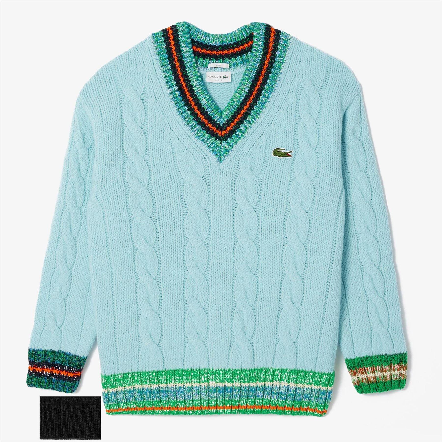 Mens Lacoste Cable Knit V-Neck Sweater in turquoise.