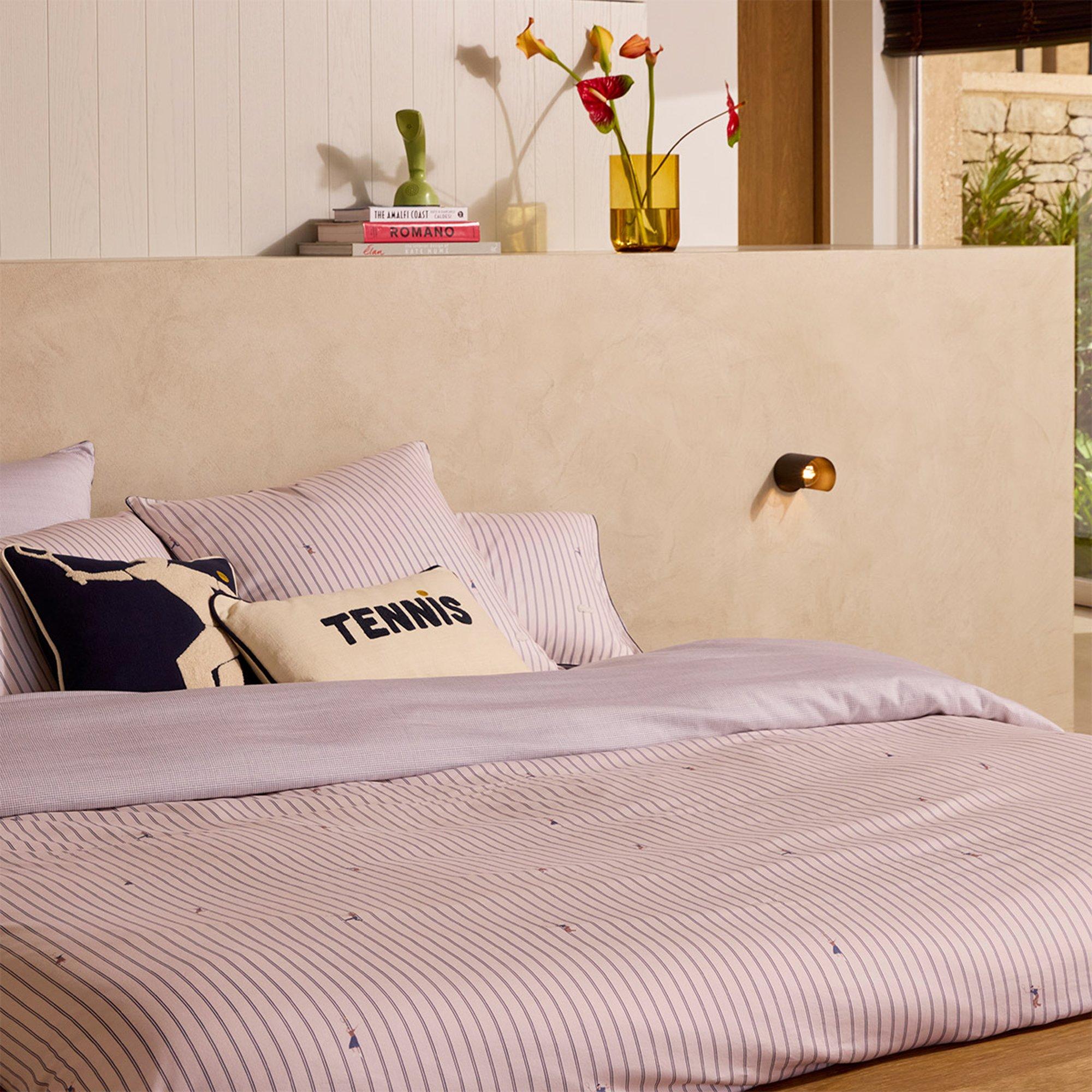 A sporty duvet cover with a pattern that combines fine graphic lines with stylised silhouettes of players in motion, for a composition balanced between energy and sophistication. Woven in 200 thread count washed sateen, from organically grown 100% cotton, the L Match Point duvet cover is soft and silky to the touch, enhanced by a matt finish with a naturally relaxed charm. Made in Turkey, it reflects the expertise of sateen weaving, a guarantee of superior quality and lasting comfort.