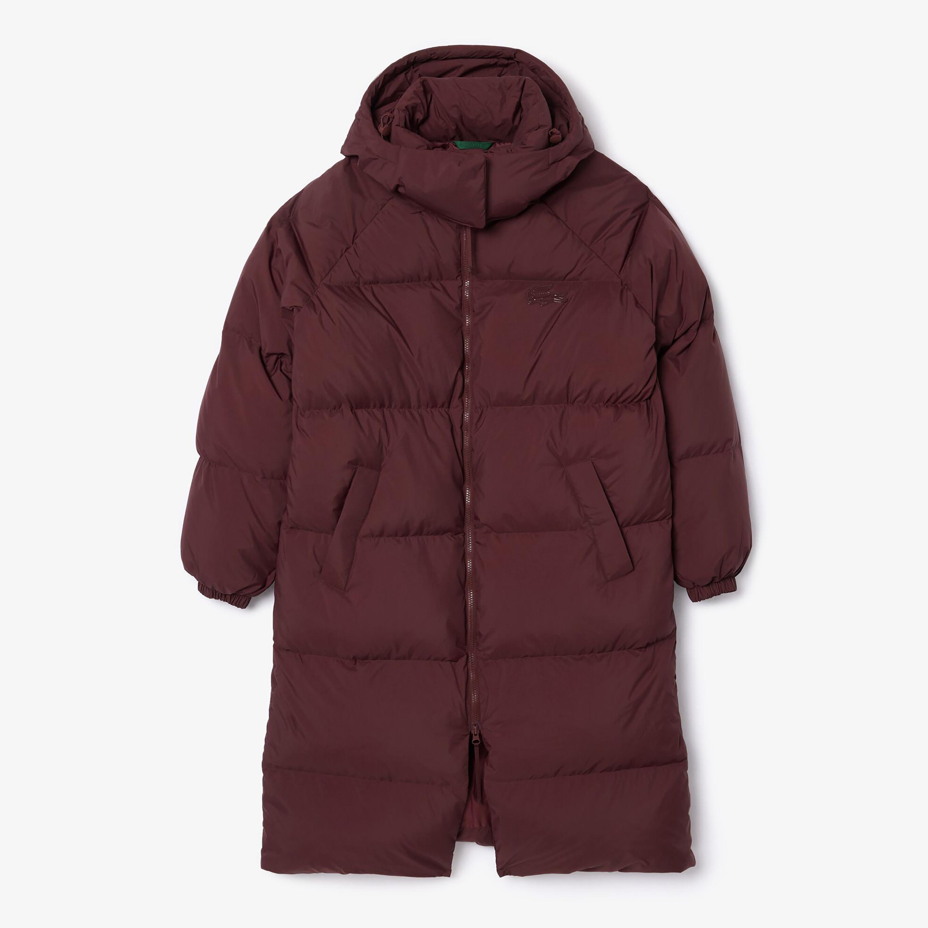 Womens Lacoste Long Oversized Down Logo Jacket in brown.