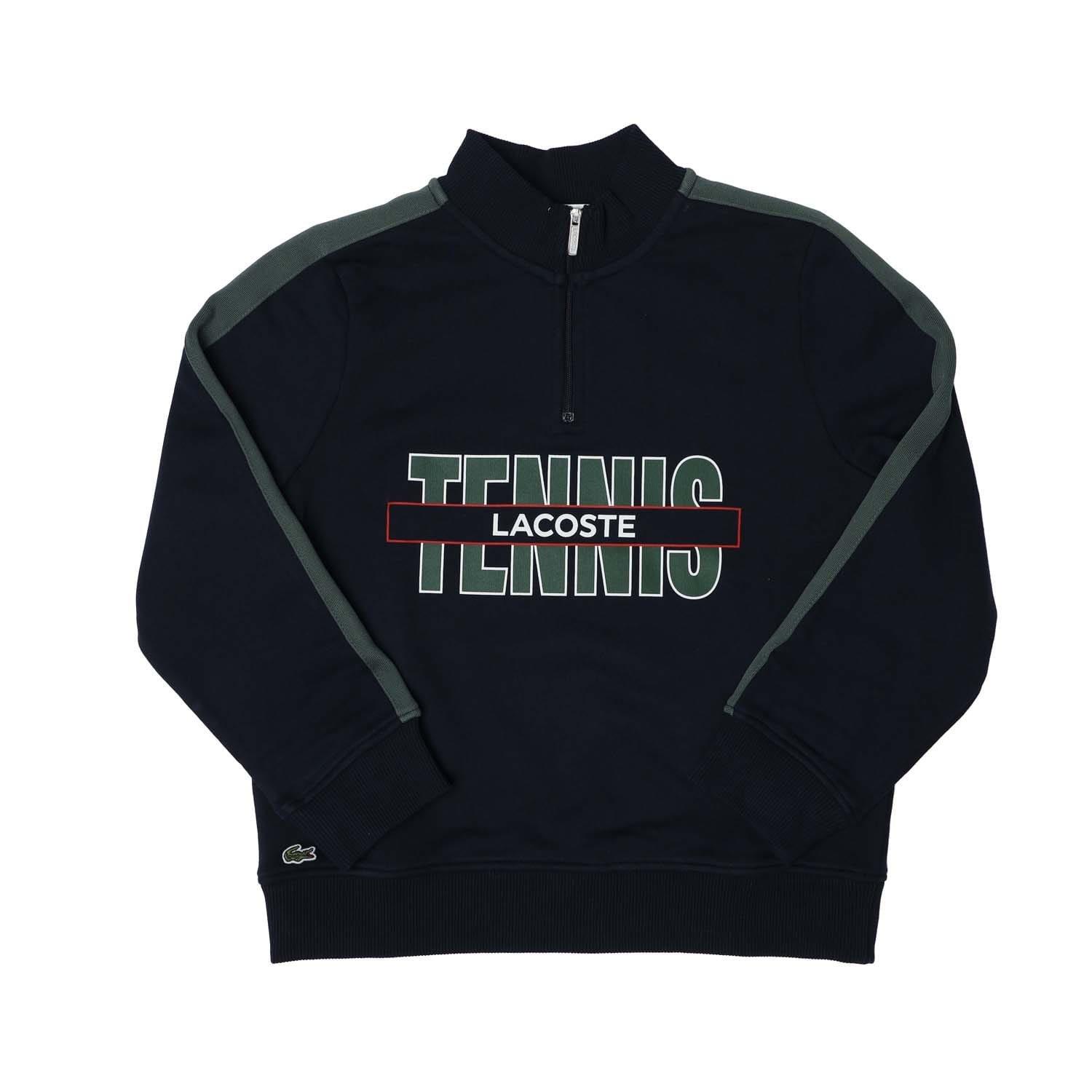 Active meets Neo Heritage : soft & high-end execustions for a new balanced silhouette Trucker sweatshirt made of french terry in organic cotton Collar in RIB 2x2 with front zipper opening for an easy to wear Fullneedle tape contrasted on shoulders Big print Tennis Lacoste at front 2 2cm recycled green crocodile