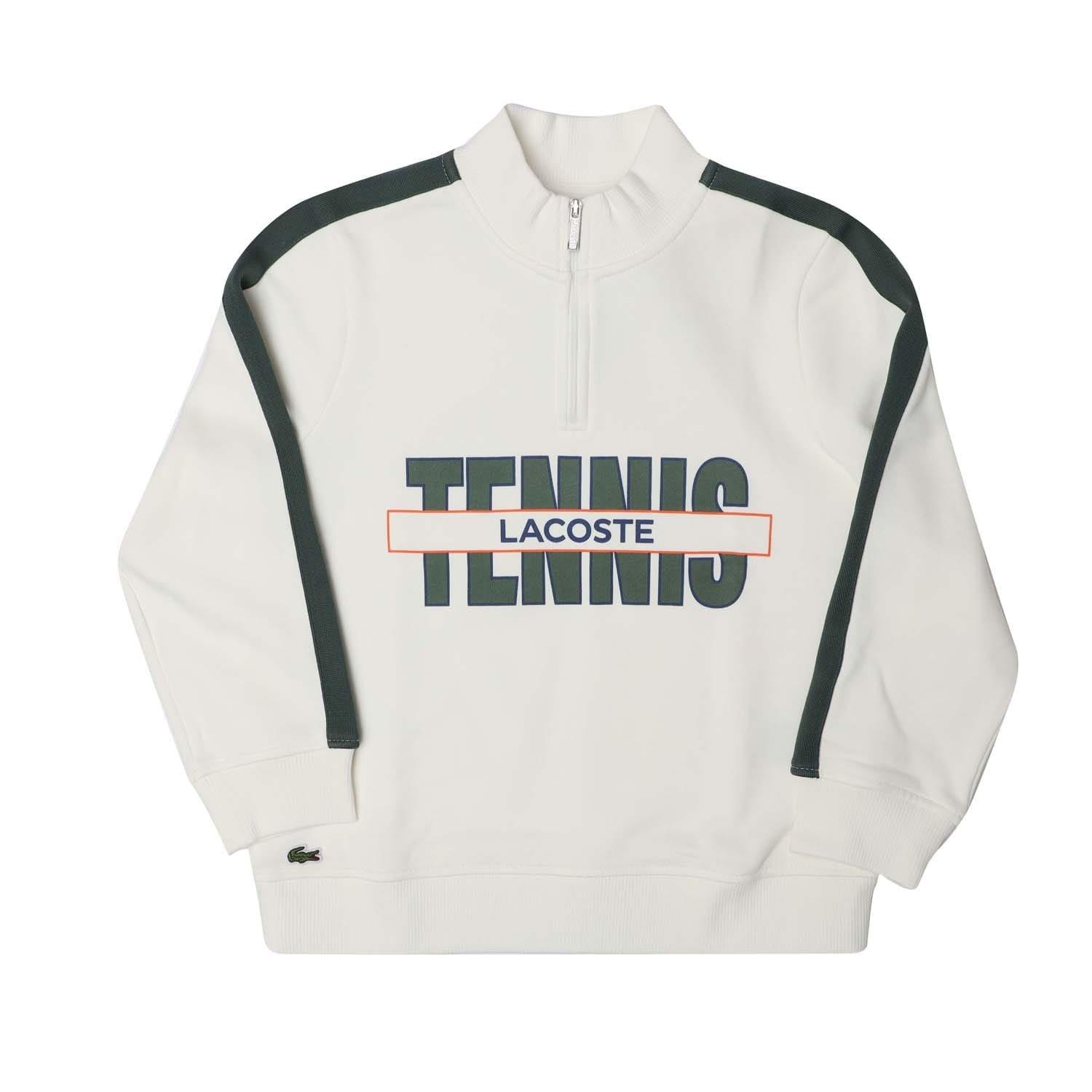 Active meets Neo Heritage : soft & high-end execustions for a new balanced silhouette Trucker sweatshirt made of french terry in organic cotton Collar in RIB 2x2 with front zipper opening for an easy to wear Fullneedle tape contrasted on shoulders Big print Tennis Lacoste at front 2 2cm recycled green crocodile