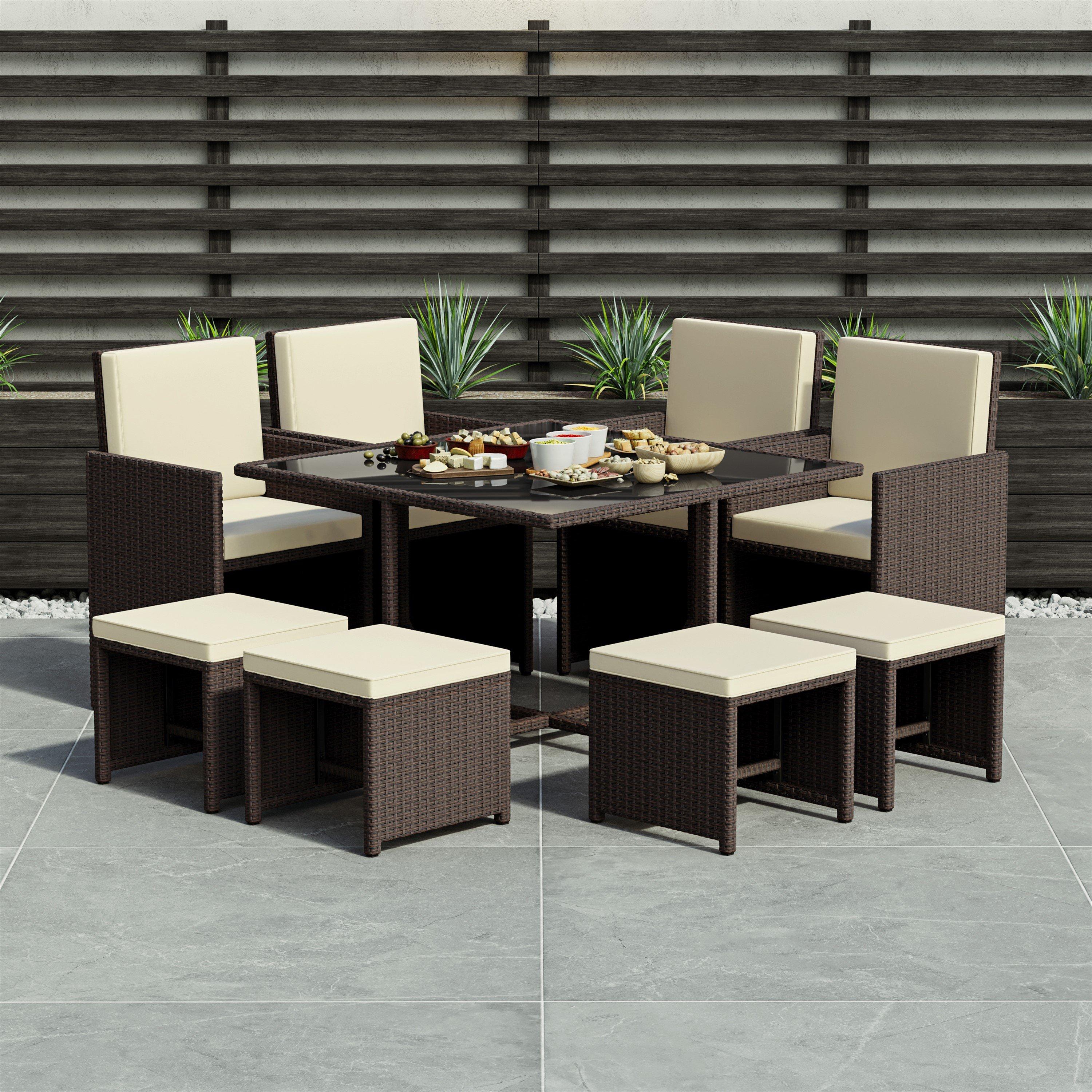 Embrace the comfort of ample seating options with four chairs and four stools, accommodating your family and guests with ease. The machine-washable cushions offer hassle-free maintenance, ensuring that your seating remains inviting and comfortable season after season.