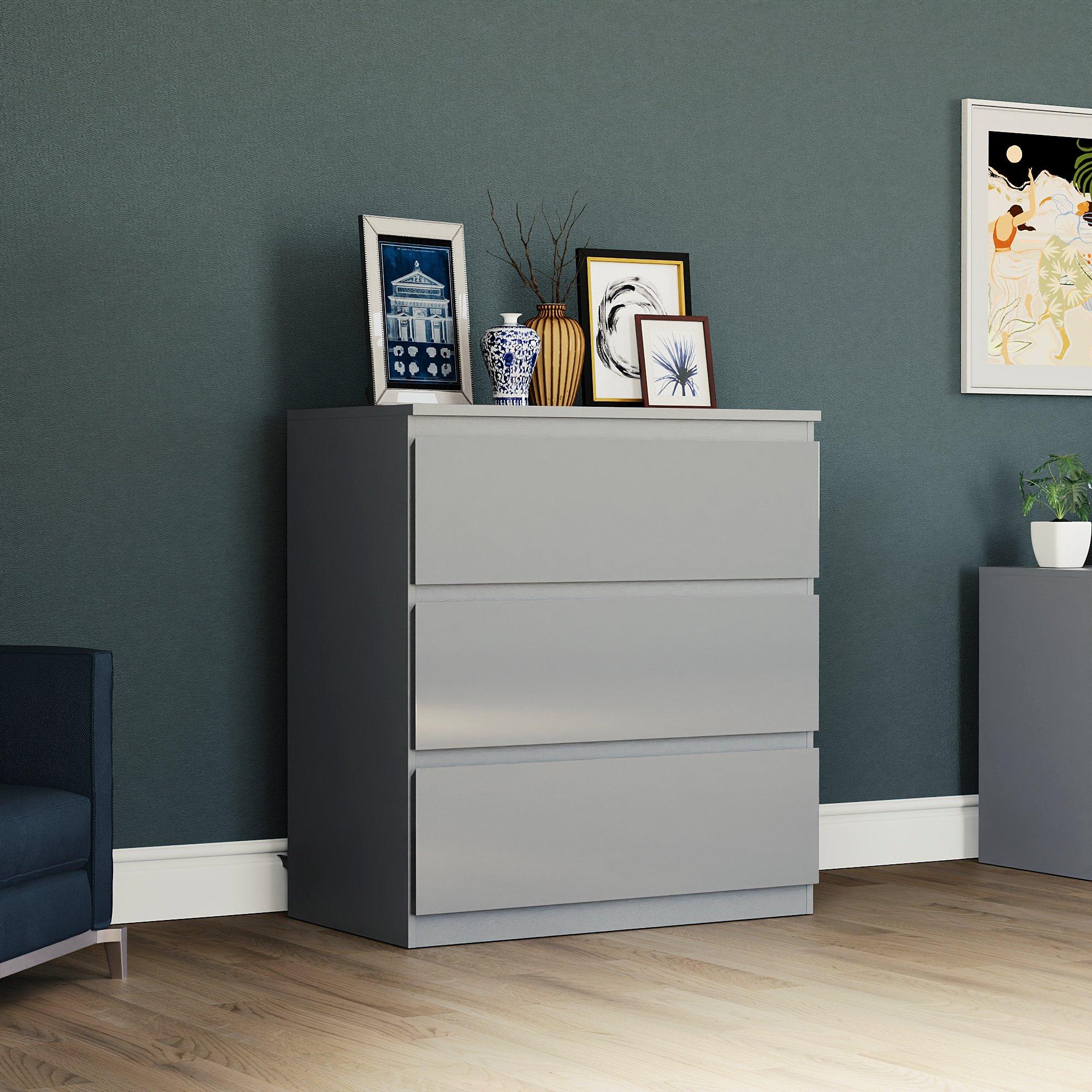 Introducing our Glinton 3-Drawer Chest of Drawers – a stylish and functional storage solution ideal for any bedroom or living space. Crafted from high-quality materials, this chest showcases a contemporary design with sleek high-gloss drawer fronts and a contrasting matte carcass.