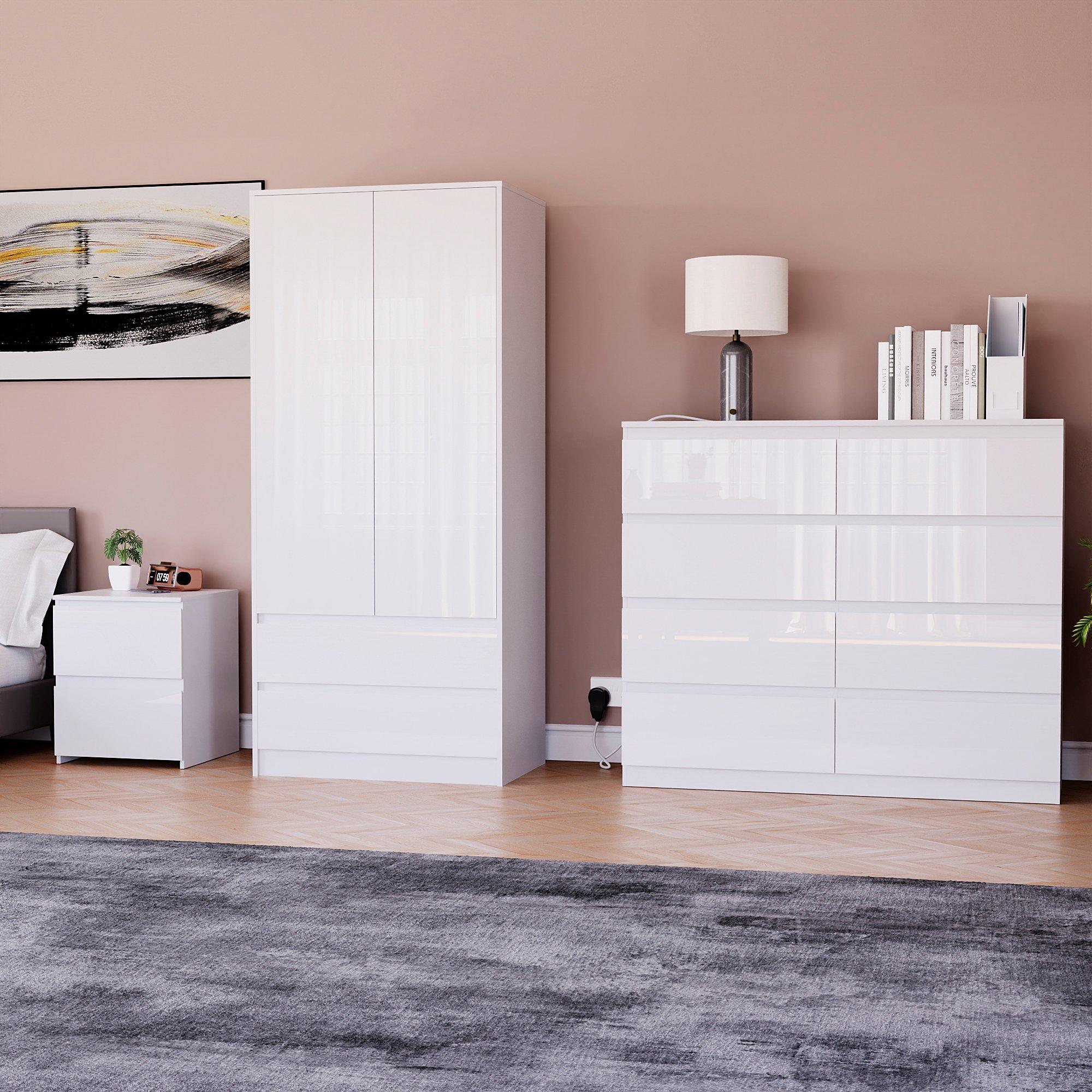 Introducing the Glinton Bedroom 3 Piece Furniture Collection, where functionality meets modern elegance for your bedroom. Crafted from high-quality chipboard with a high gloss finish, each piece in this set embodies durability and sophistication.