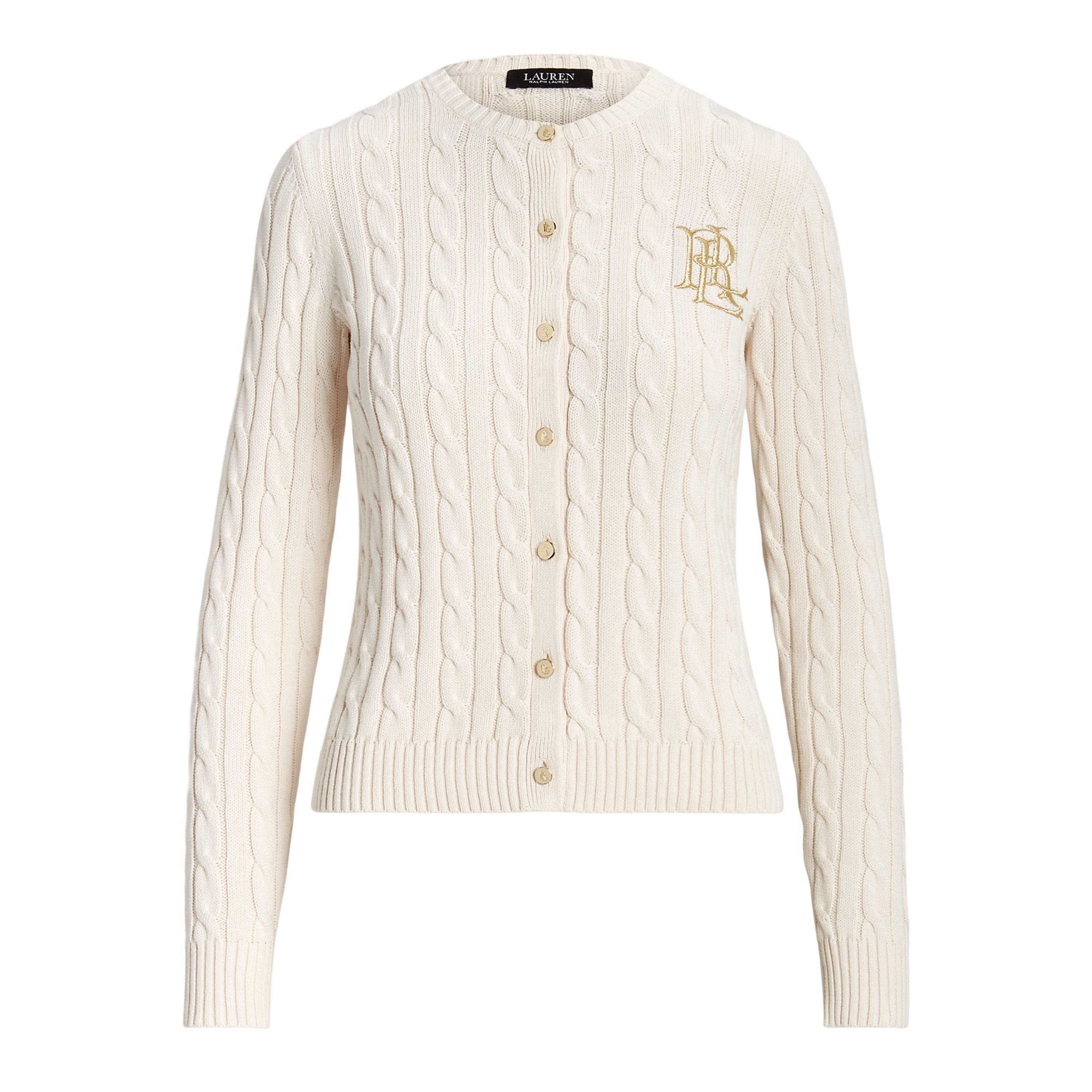 The Cable Knit Cotton Long Sleeve Cardigan from Lauren by Ralph Lauren showcases cable-knit detailing throughout. Featuring monogram embroidery at the chest and button-front closure, this essential piece offers heritage styling with ribbed trims that create a neat, flattering shape.