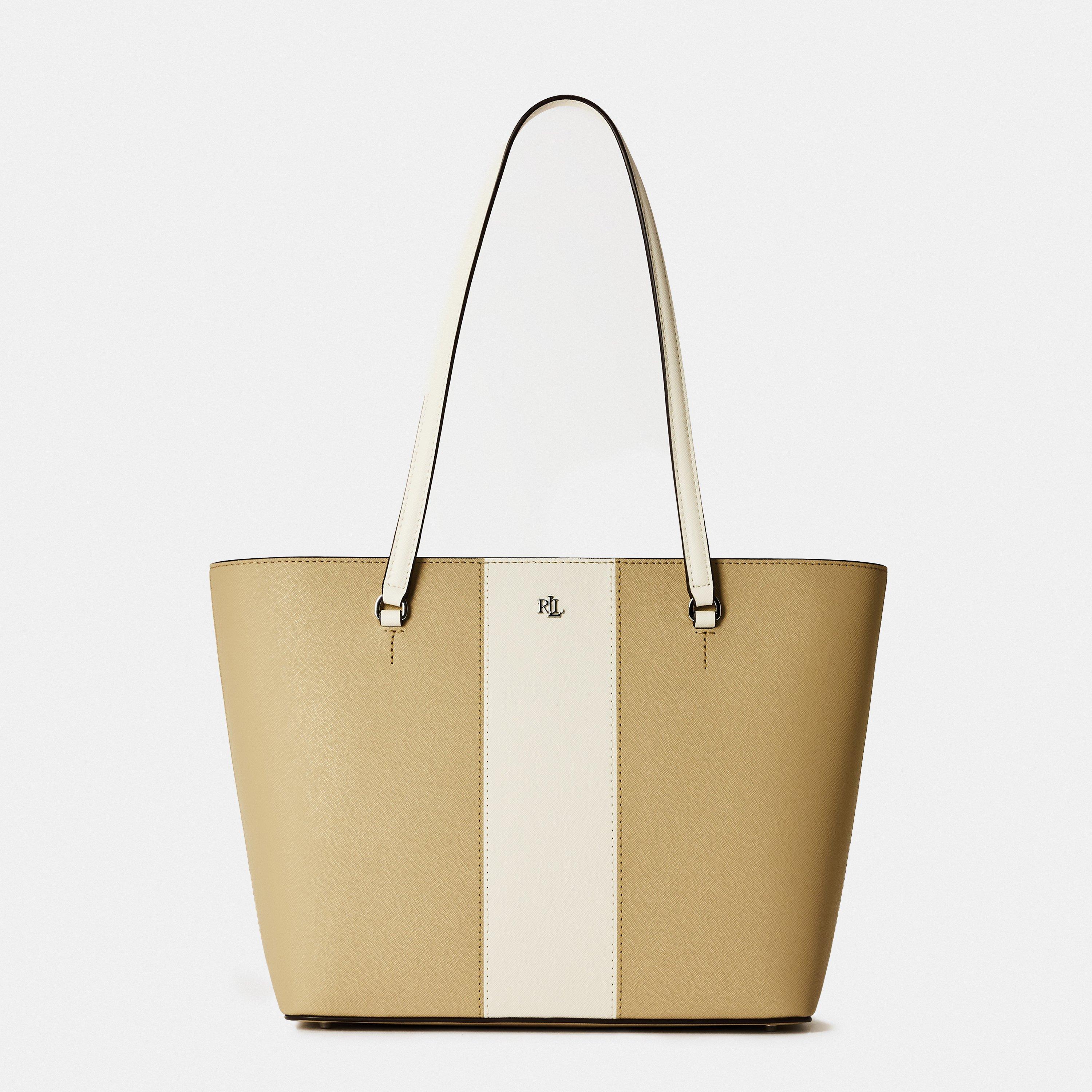 Lauren Ralph Lauren monogram in brass-finished metal on the front for instant brand recognition.