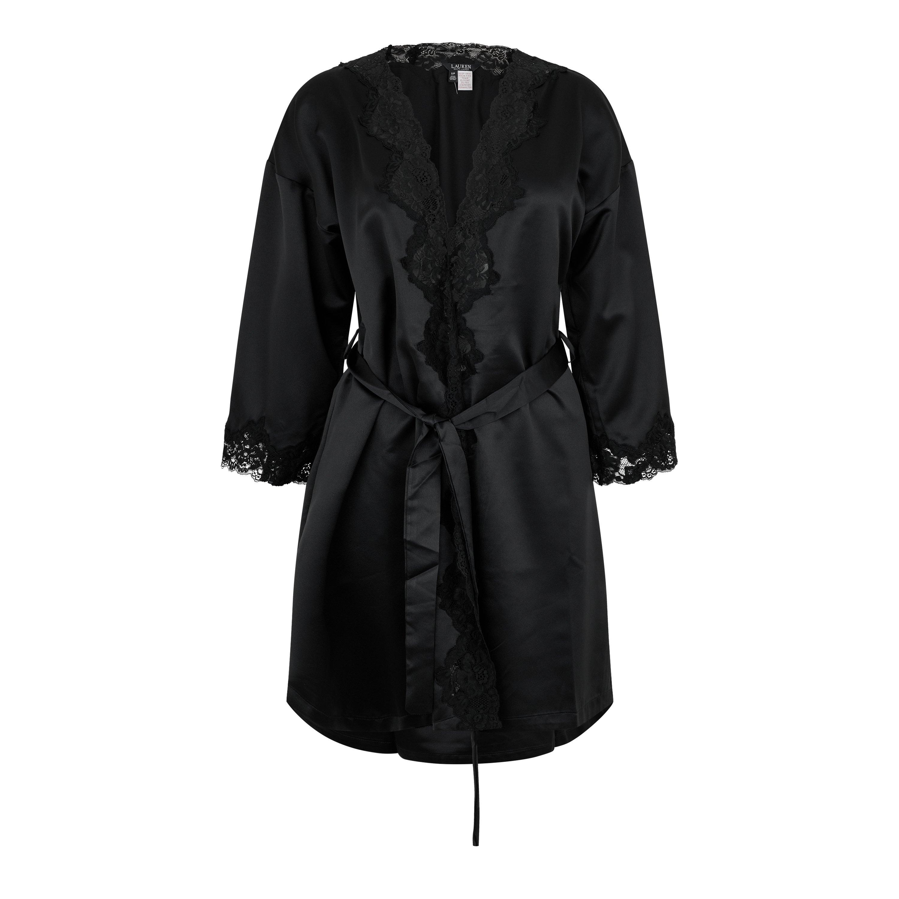 Delicate lace trim adorns this luxurious Lauren by Ralph Lauren dressing gown, creating an elegant silhouette for your morning routine. The wrap-style design features a self-tie belt that cinches perfectly at the waist, while the mid-length cut offers just the right amount of coverage. Crafted from smooth satin fabric, this piece combines comfort with classic style.