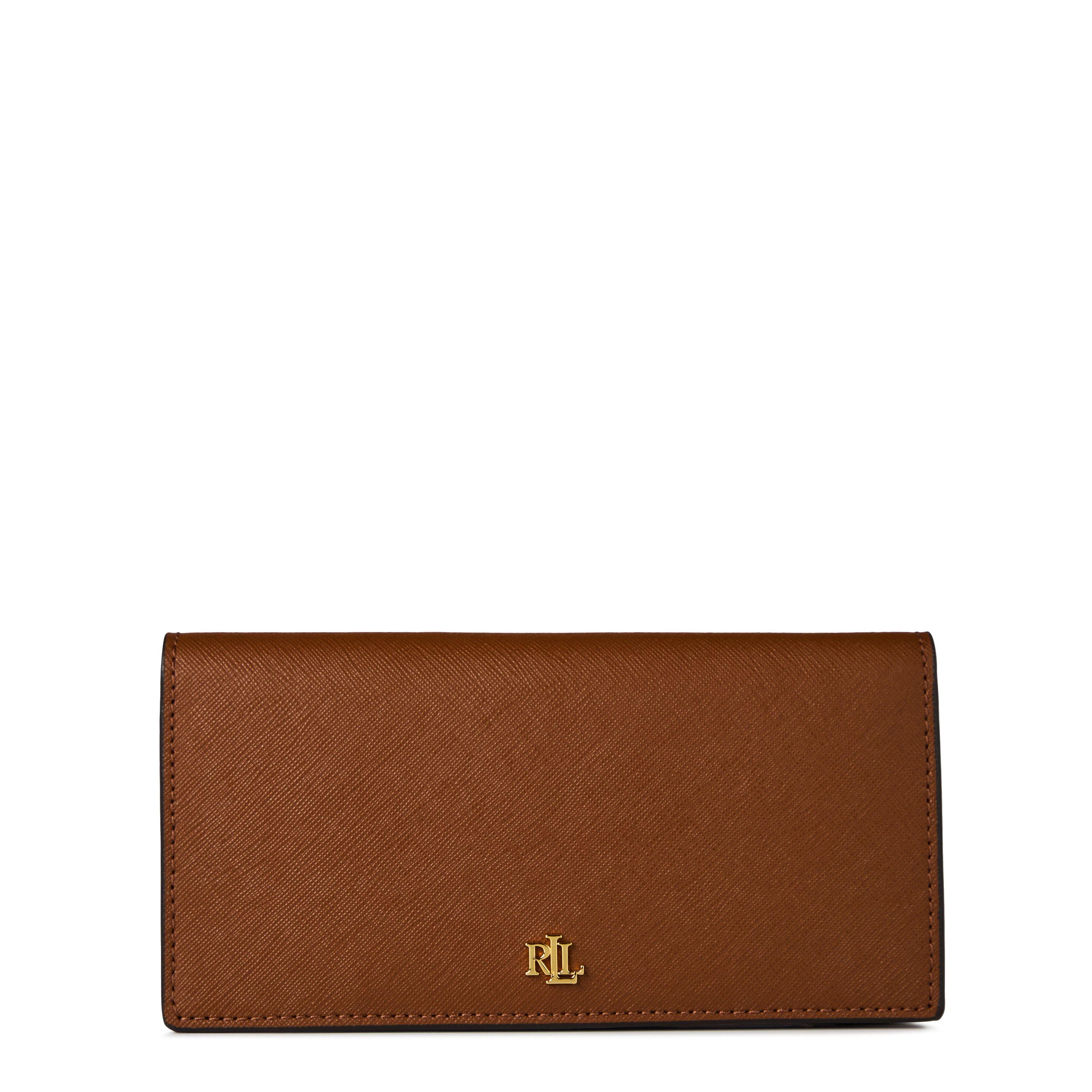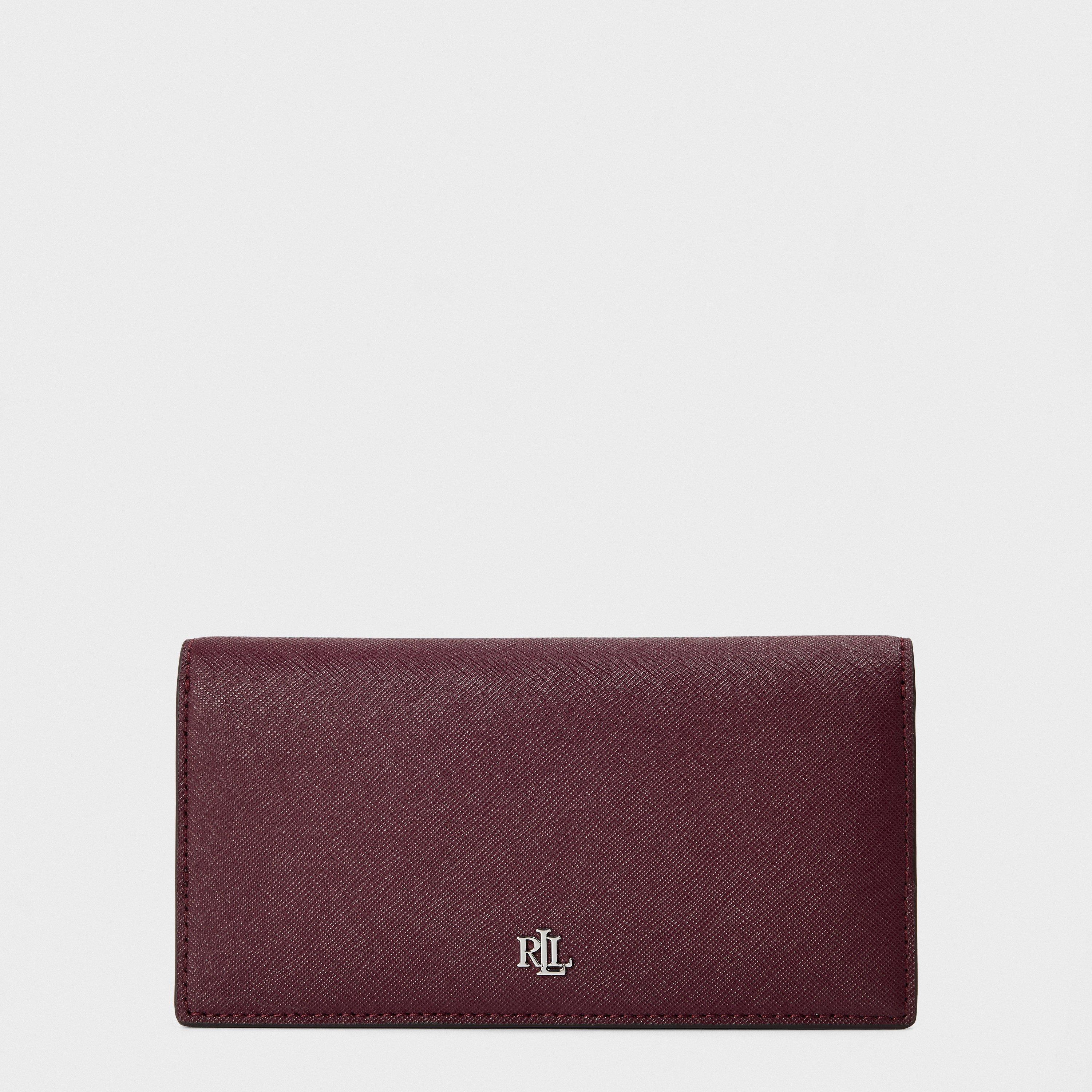 Distinguished by its textured leather finish and signature gold-tone hardware, this Lauren Ralph Lauren slim billfold wallet combines practicality with timeless style. The compact design features meticulous attention to detail, from the branded metal monogram to the precision stitching along its edges. Multiple card slots and a dedicated ID window make this wallet as functional as it is sophisticated.