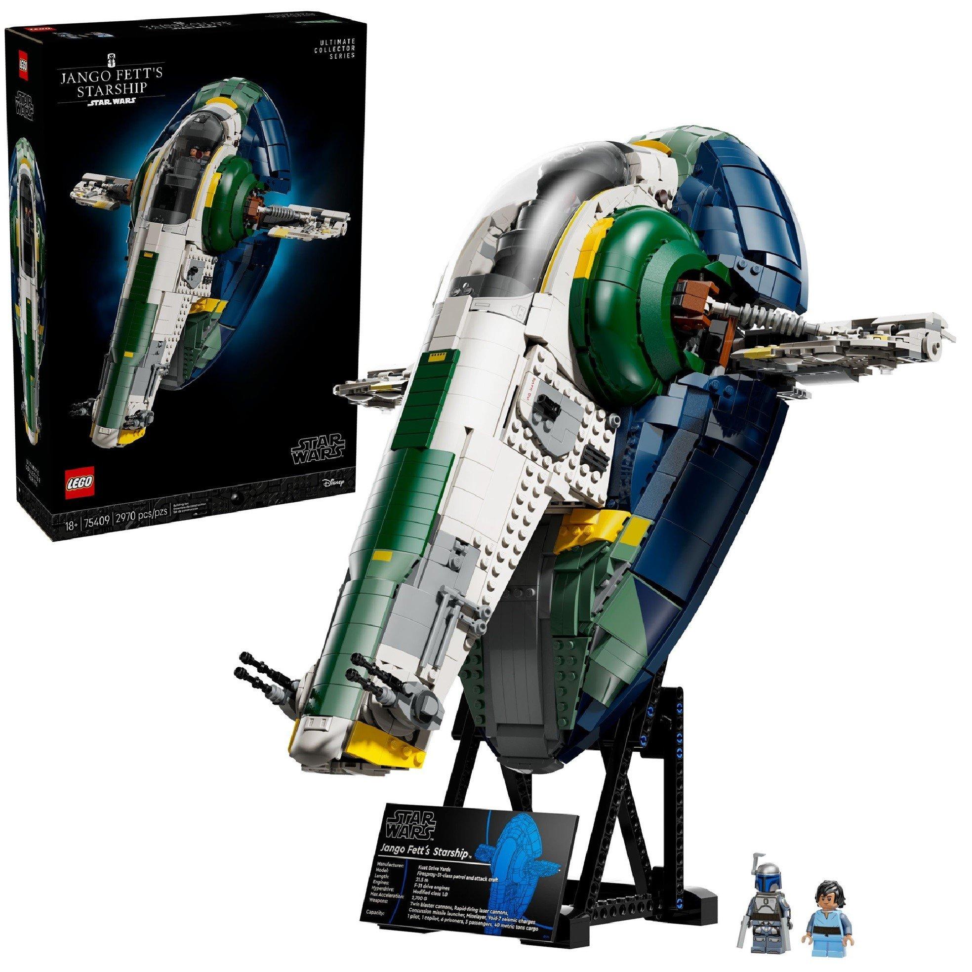 LEGO® Star Wars™ Ultimate Collector Series set – Create a spectacular Star Wars display piece with this buildable model of Jango Fett's Firespray-class starship from Star Wars: Attack of the Clones 2 LEGO® Star Wars™ minifigures – The two LEGO minifigures – Jango Fett and young Boba Fett – can be placed in the removable segment of the cockpit Authentic details: Take down the cockpit roof to see the detailed interior. Push open the main entrance, discover the cargo hold with the seismic charge and aim with the blaster cannons Display the model the way you like it: Place your starship on a flat surface in landing mode or display the model in vertical flight position on the buildable stand with information board LEGO® Star Wars™ gift for creative adult fans – This buildable model makes a great gift for yourself or another Star Wars fan, an experienced LEGO builder or a collector of LEGO Star Wars UCS building sets 3D building instructions – Enjoy every step of your building project with the LEGO® Builder app. In the app, you can view 3D digital views of this buildable model as you build, track your build progress, or save sets LEGO® Star Wars Collectible Sets for Adults – Bring a galaxy far, far away into your home with LEGO Star Wars™ building sets for adults. The sets are designed for fans like you who love mindful and creative activities Model to build and display – The LEGO® Star Wars™ Starship from this 2,970-piece fantasy set measures over 19 cm high, 44 cm long and 39 cm wide