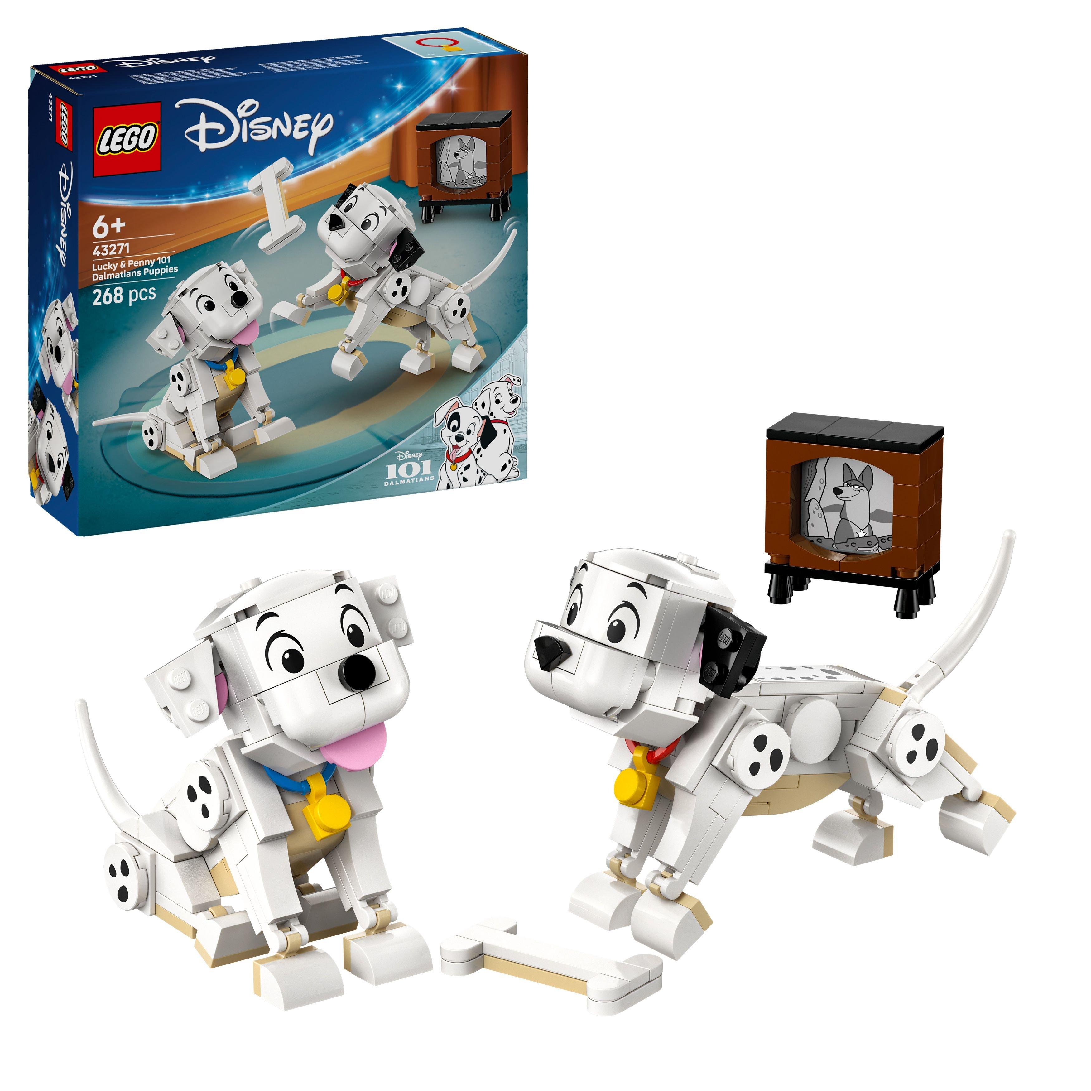 Thrill kids or animal fans aged 6 years and over with the Lucky & Penny 101 Dalmatians Puppies (43271) in this LEGO® Disney building toy. Packed with play options, the building toy includes 2 Dalmatian puppy characters from the Disney classic 101 Dalmatians, plus a brick-built toy bone and a small TV. The LEGO Disney puppy characters have movable heads, legs and tails, and can be posed in a variety of ways. This cute toy buildable playset present makes a Disney gift-giving idea for girls, boys and fans. It works well with other LEGO Disney building sets in the range (sold separately) and is easy to play with on the go. Plus, adult Disney fans who love cute dogs can join a young fan and create an advanced companion set (101 Dalmatians Puppy building set for adults, sold separately). Kids also can enjoy an easy, intuitive building adventure with the LEGO Builder app, where they can zoom in and rotate models in 3D, save sets and track progress. Building set contains 268 pieces.