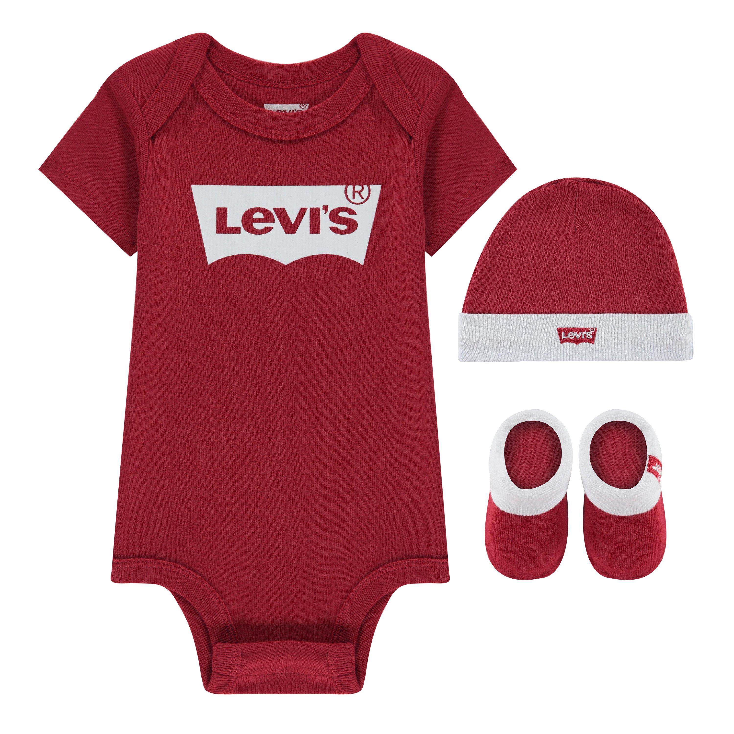 This Levis Three Piece Set has been crafted from a soft cotton jersey, boasting the signature Batwing logo print on the front, comes with knitted booties and a Batwing logo embroidered hat for that added comfort and style.