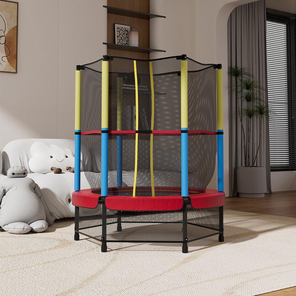 Enjoy worry-free playtime for your kids with this trampoline, perfect for sunny days of energetic fun. Featuring a high enclosure net that is reinforced with protective poles and connects to the jumping surface, it offers a secure environment for higher jumpers, minimizing the risk of accidental falls or contact with springs. Crafted with rust-resistant steel frame, its sturdy structure ensures stability for safe and enjoyable play.