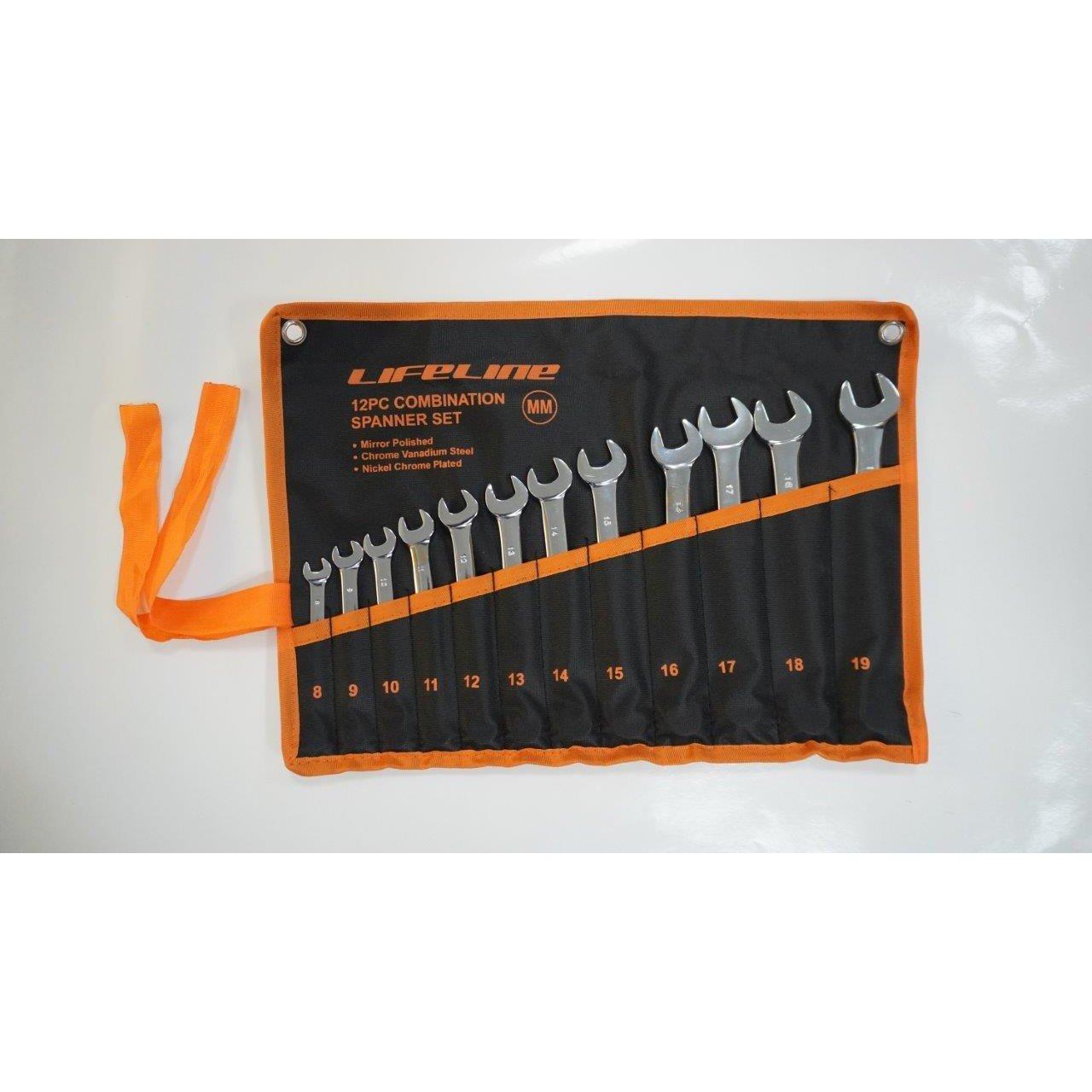 Set contains: 12 pcs of Combination spanners, Full polished, Mirror Finished Sizes: 8,9,10,11,12,13,14,15,16,17,18,19mm. Forged from the highest quality Chrome Vanadium steel Includes pouch with marked pockets for each spanner Open ends offset at a 15-degree angle for confined working areas 15-degree angle offset of box ends provides clearance over obstructions Corrosion-resistant Nickel chrome plated 25% More Torque than competitive spanners Upgrade your toolkit today with these durable and versatile spanners.