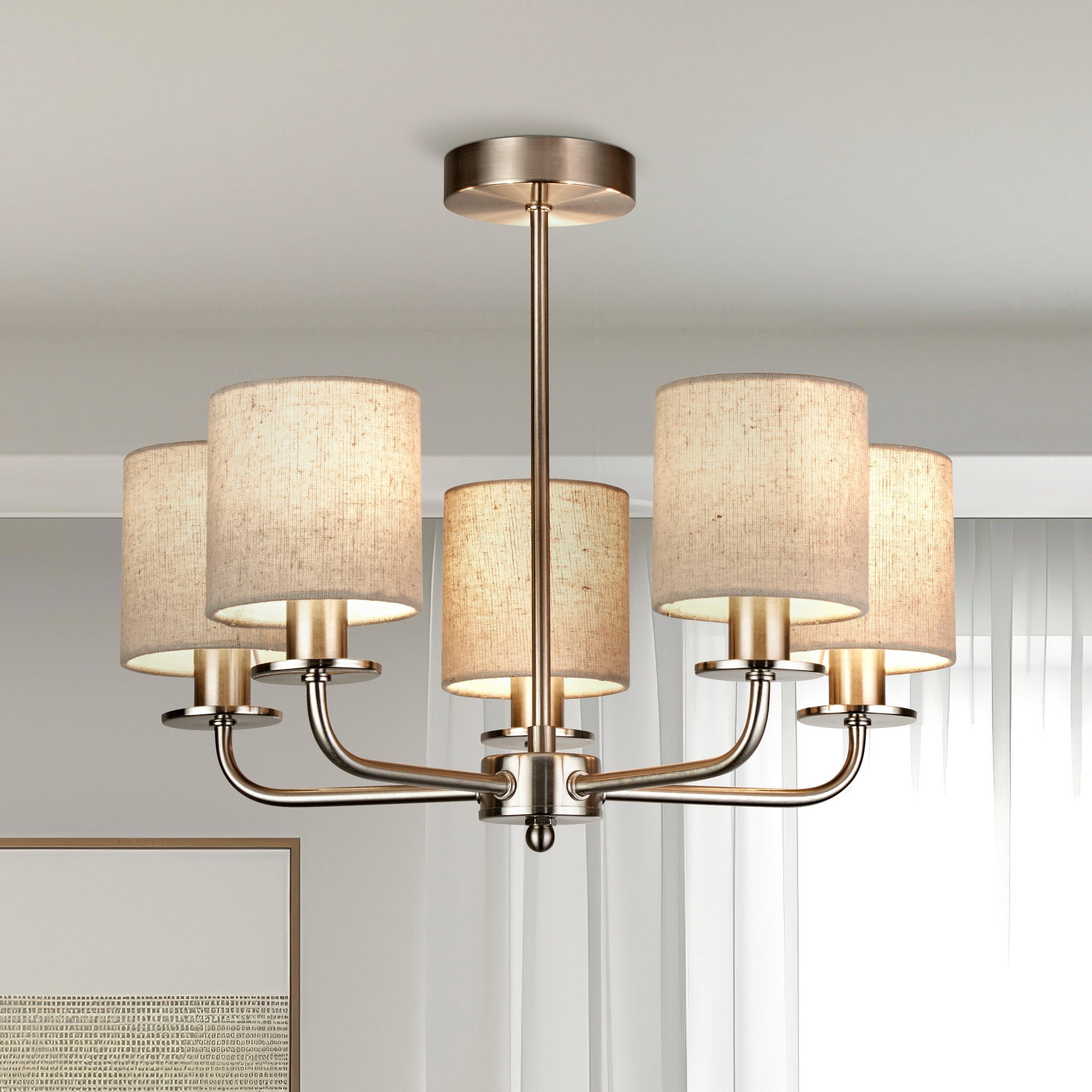 Create a striking centrepiece in any room with this 5-light ceiling light. Featuring a satin silver finish and five elegant linen shades, it,s the perfect addition to bedrooms or living rooms. The neutral colour scheme effortlessly complements a variety of interior d,cor styles. With a height of 11.5cm and a width of 44cm, it is compatible with E14 lampholders and requires 7W golf ball LED bulbs (not included).
