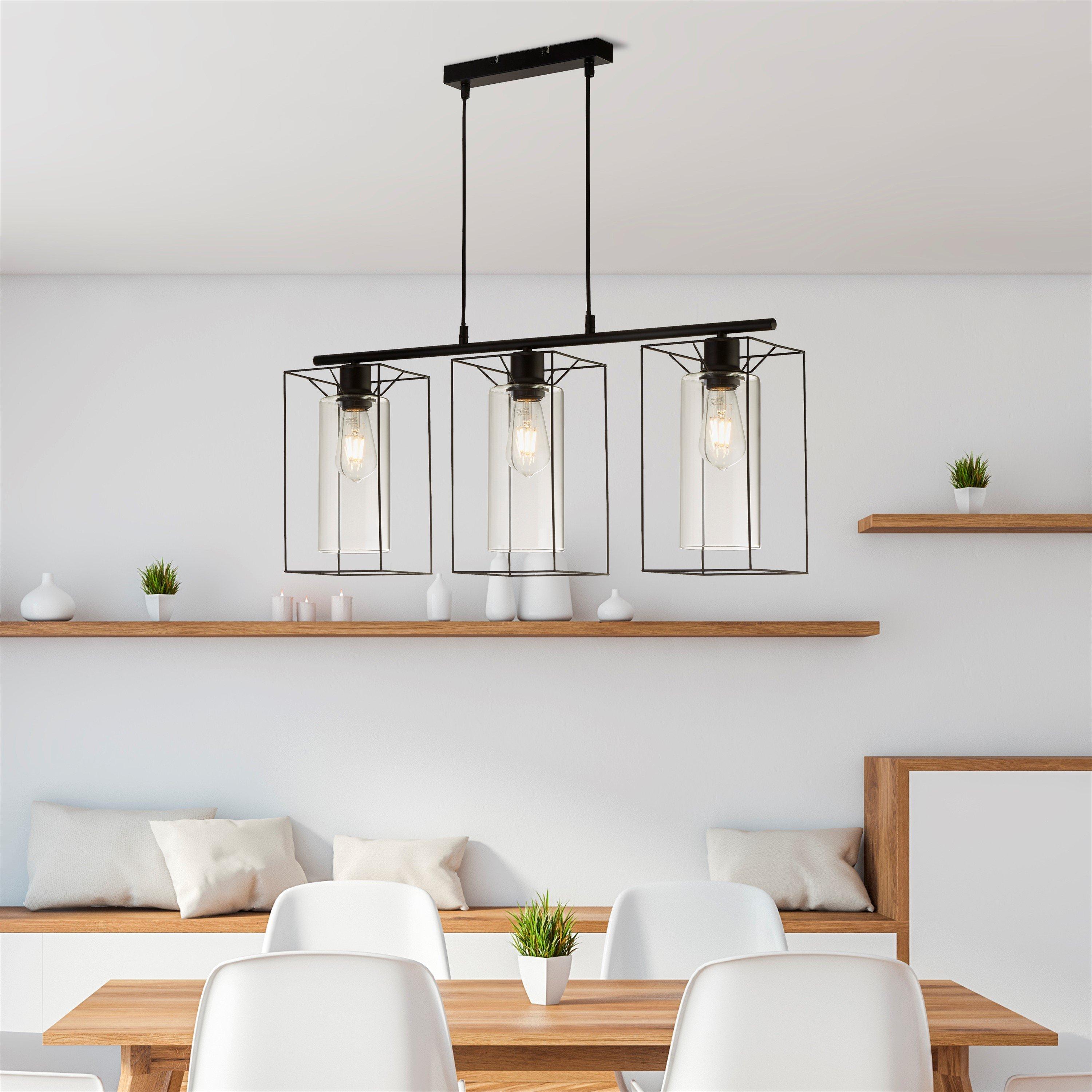 This statement 3-light ceiling pendant adds a bold touch to any room. Featuring a black frame and clear glass inner, its industrial style makes it an eye-catching addition to any home. Perfect for creating a striking focal point in living rooms, dining areas, or kitchens. With a total height of 137cm and a width of 75.5cm, it is compatible with E27 fittings and requires three 10W GLS LED bulbs (bulbs not included).