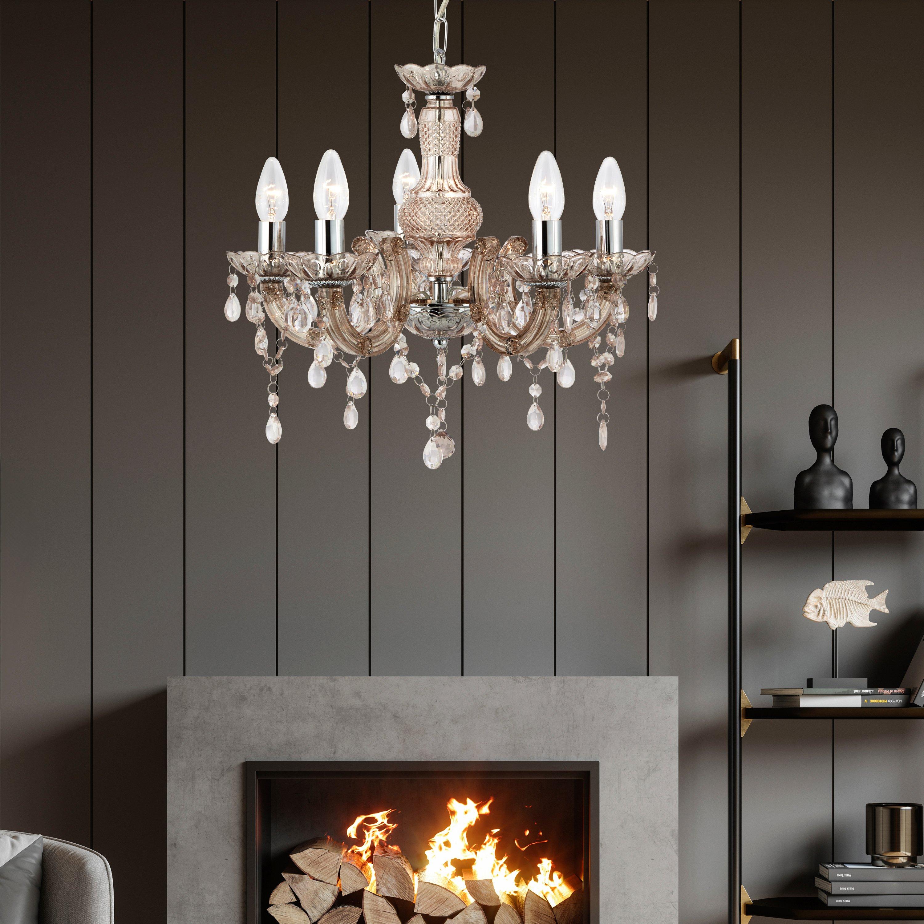 Elevate your space with this luxurious pendant, featuring elegant curved arms in mink frame with chrome lamp holders. Sparkling clear crystal droplets refract light beautifully, creating a mesmerizing display. With its graceful proportions of 120cm total drop, 42cm height, and 48cm width, this piece adds timeless glamour to any room. Designed for E14 fittings, it requires 5 x 60W halogen bulbs (not included).
