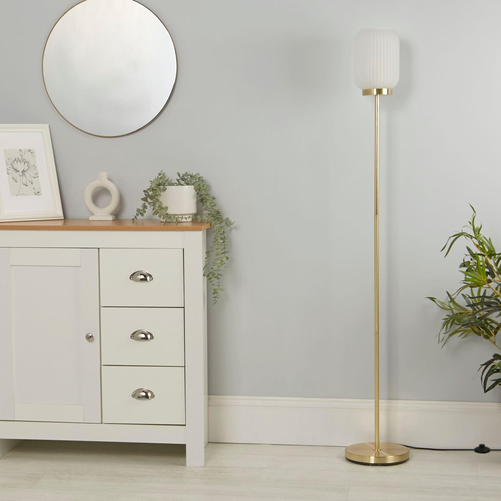 A simple play on art deco style, the Pearl floor lamp is the perfect combination of frosted glass and brushed gold finishes.