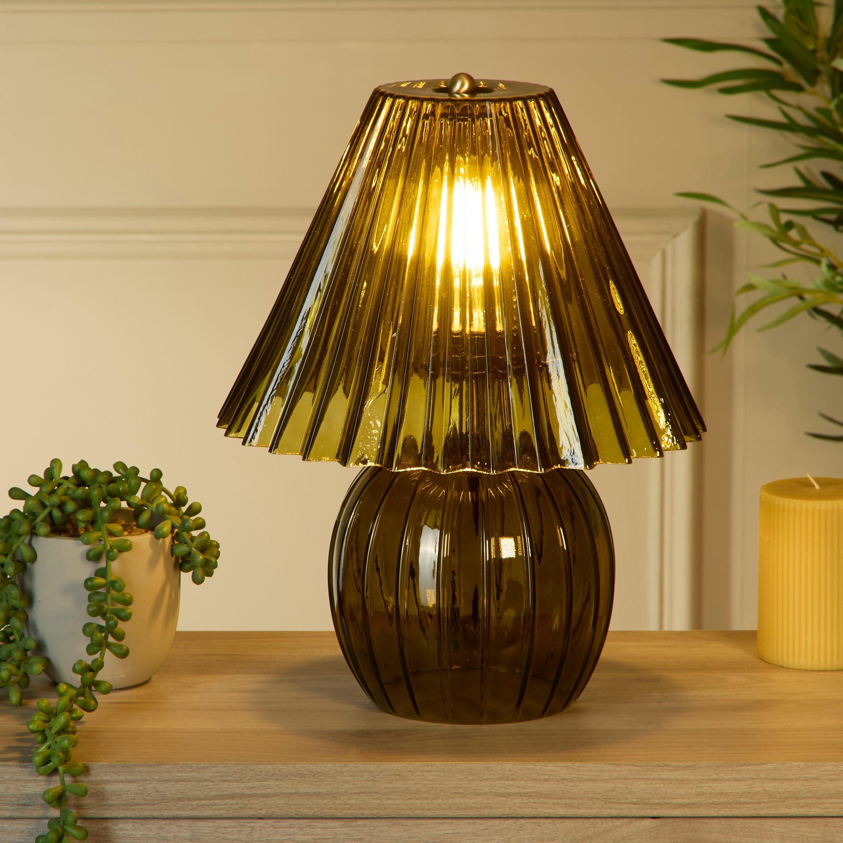 Introduce a bold, jewel-like accent to your interior with this ribbed green glass table lamp. The moulded emerald base is detailed with vertical ribbing to add texture and depth, and it’s paired with a coordinating ribbed glass shade for a cohesive, sculptural finish. Antique brass highlights add a warm vintage note and sit beautifully against the deep green glass. Once illuminated, the ribbed surface softly refracts the light to create an atmospheric, gentle glow, making it ideal for bedside tables, consoles, or living room side tables. The lamp measures 34cm in total height and 27.5cm in width, and it requires 1 x E27 10W GLS LED bulb (not included).