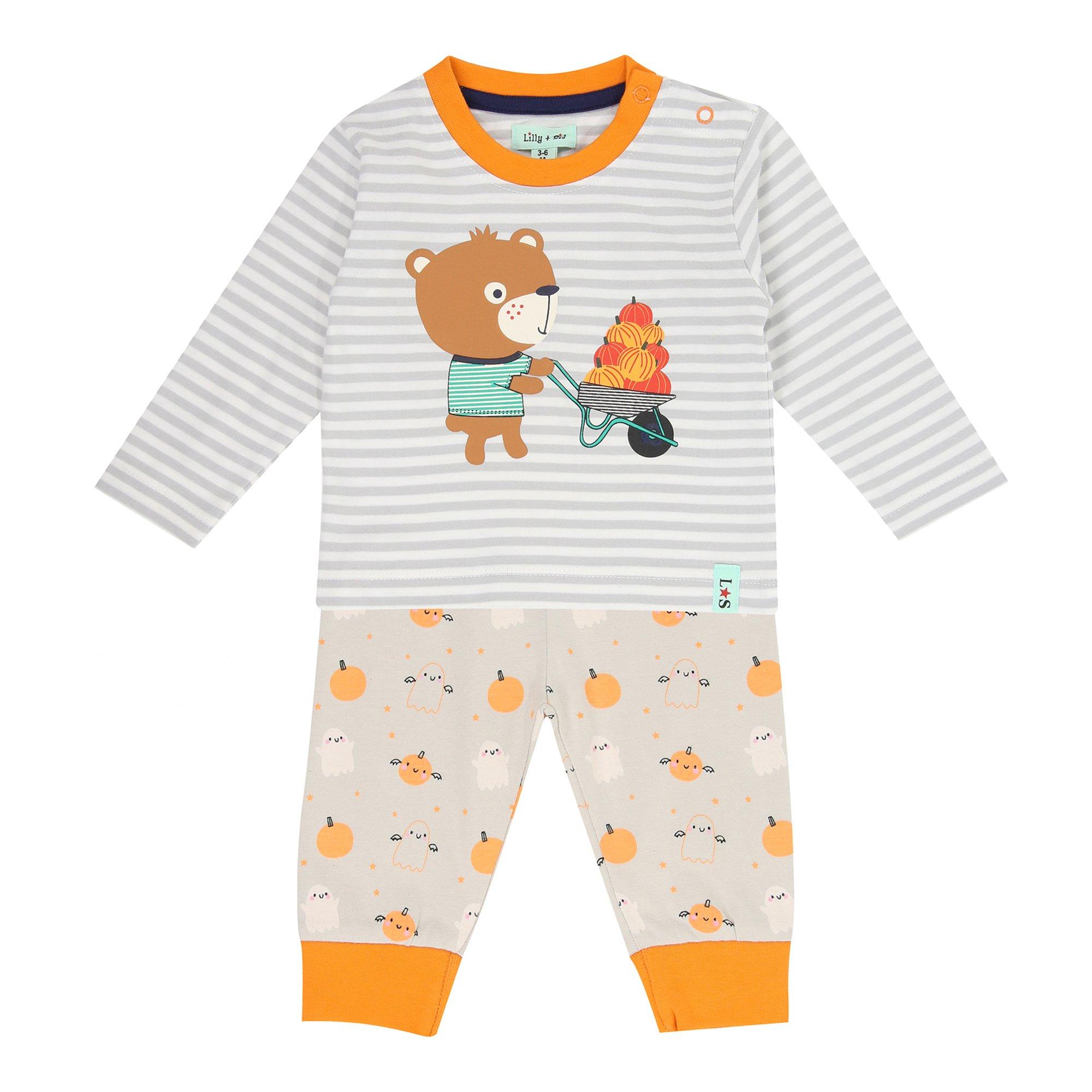 Lilly and Sid's Pumpkin Ghost Baby Bodysuit features seasonal Halloween motifs with practical snap fastenings for easy everyday wear. This charming outfit with playful design elements and functional details provides both style and practicality, making it ideal as a costume or everyday Halloween wear.
