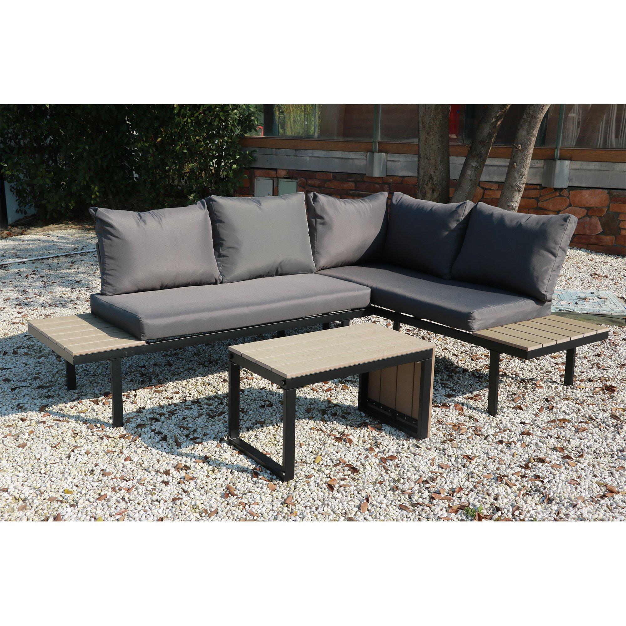Sofas and a freestanding coffee table Wood effect table top and side table top A tough and durable structure Fitted with seat and back cushions for comfort Size: 2 seat sofa: 70 x 154 x 68cm2 seat sofa with corner back: 70 x 164 x 68cmtable: 70 x 39 x 40cm Materials: Steel and polywood Fabric: 180g Polyester.