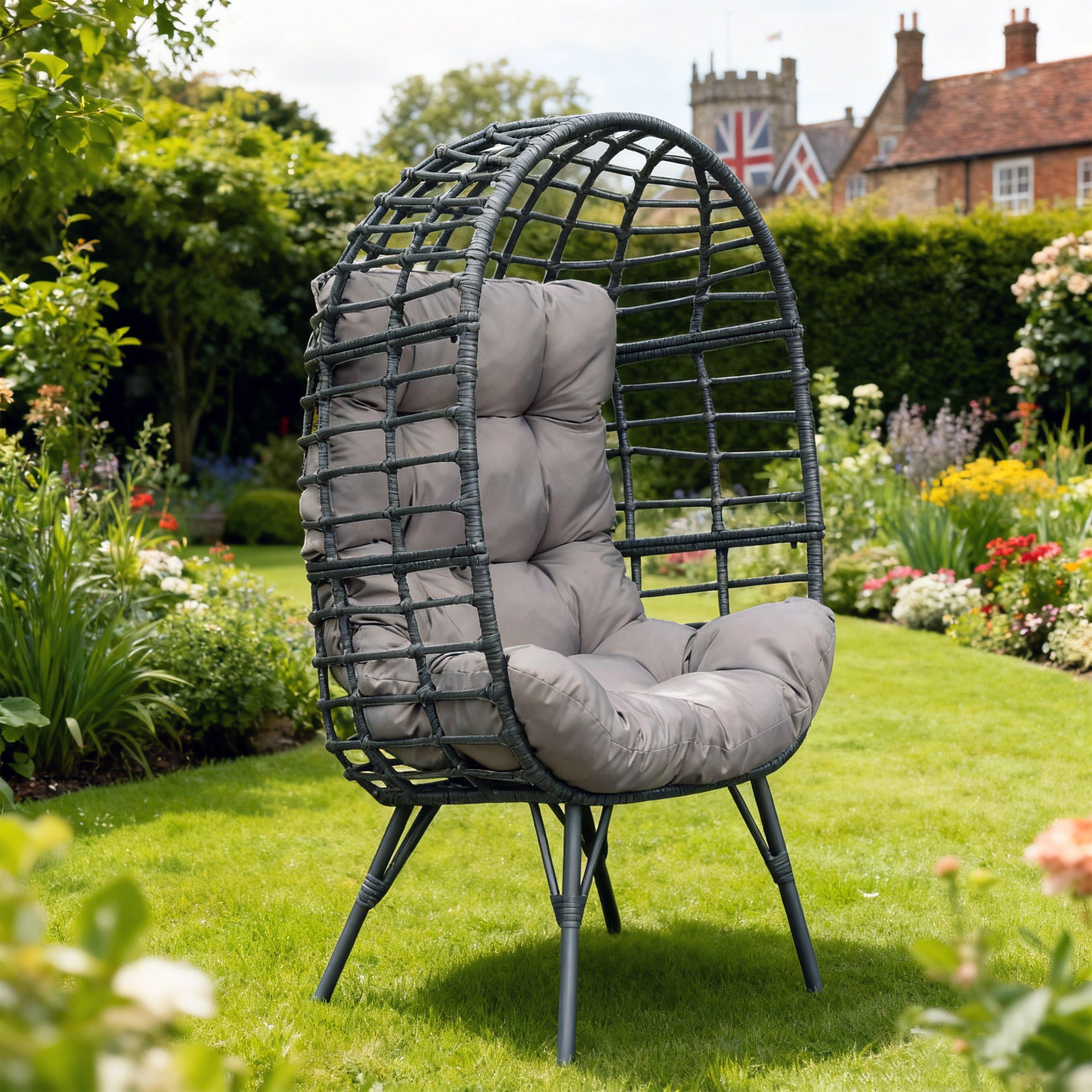 Add a modern statement piece to your home or patio with this unique egg-shaped lounge chair. Featuring a sturdy open-weave rattan frame and plush, tufted cushions, this chair offers both style and comfort for relaxing, reading, or unwinding. The high back and deep seat provide excellent support, while the contemporary design complements any indoor or outdoor décor. Perfect for creating a cozy retreat in your living room, garden, or balcony.