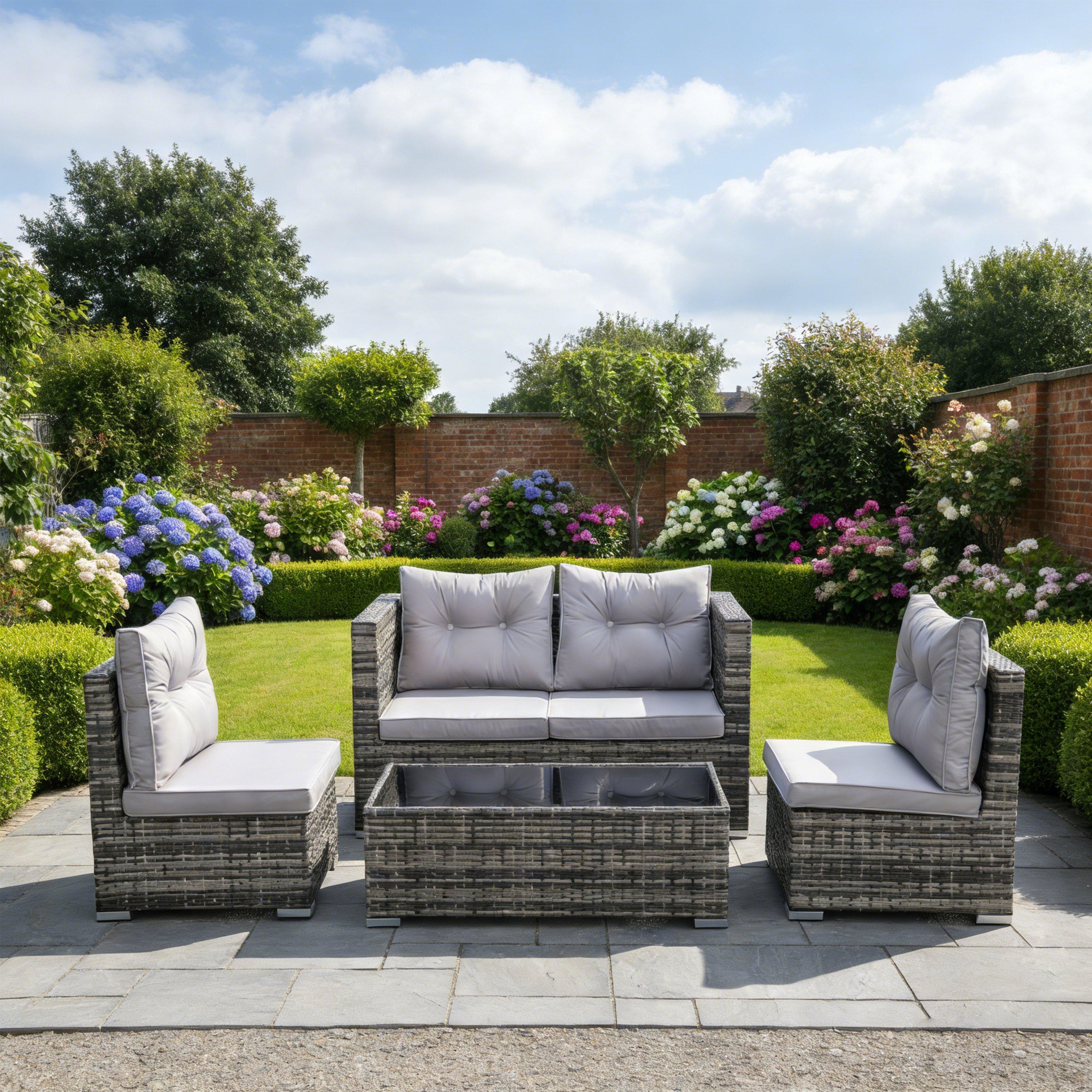Upgrade your outdoor living area with this stylish 4-piece rattan patio furniture set. Featuring a comfortable three-seater sofa, two spacious armchairs, and a sleek glass-top coffee table, this set is perfect for relaxing or entertaining guests in your garden, patio, or balcony. The durable, weather-resistant rattan construction ensures long-lasting use, while the plush, tufted cushions provide exceptional comfort. With its modern design and neutral tones, this set adds a touch of elegance and functionality to any outdoor space.