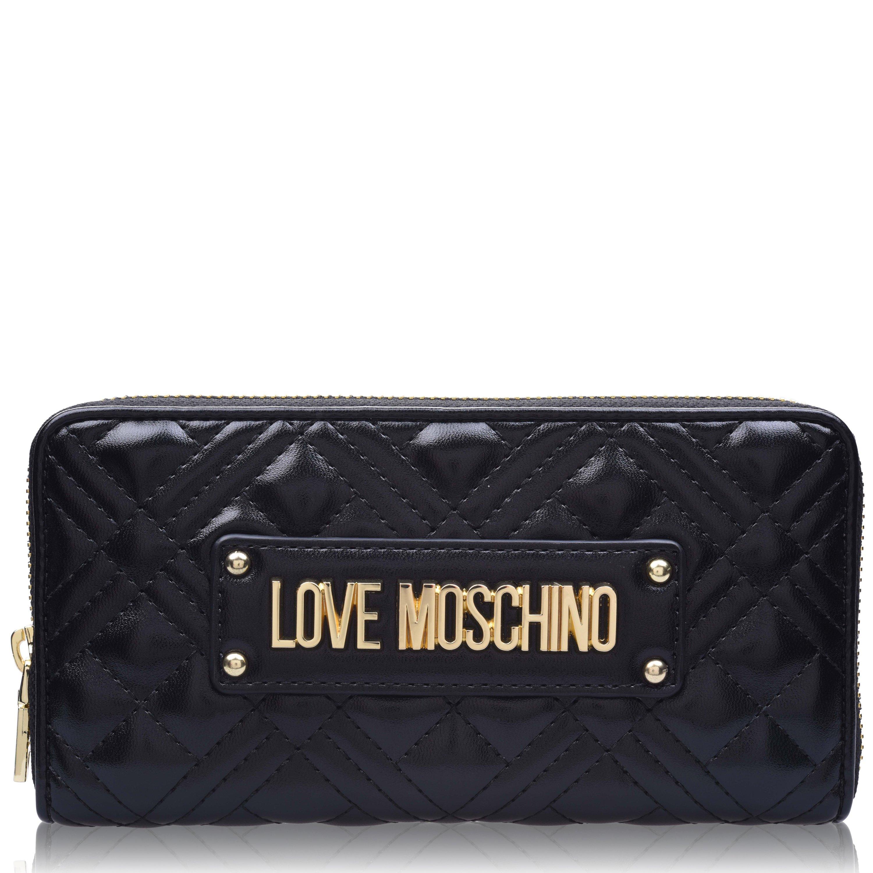 Bring luxe sophistication to your accessories collection with this Quilted Logo Purse from Love Moschino. Expertly constructed from a luxuriant faux-leather composition, this piece feature a top zip fastening that reveals a central compartment divided into two large pockets with a zipped coin pouch, eight card slots and two note pockets. Decorated in a solid block colour throughout, the design is embellished with the Love Moschino logo rendered upon the front in gold toned metal hardware for instant brand recognition and an unparalleled high-end finish.