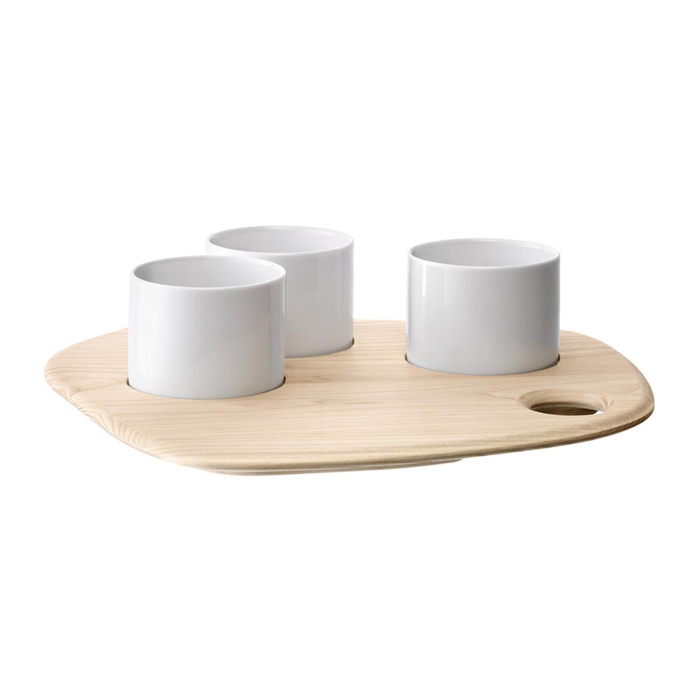 Impress your dinner guests with this serving board from LSA International. This design features three porcelain bowls that are perfect for serving olives, dips, and bread.