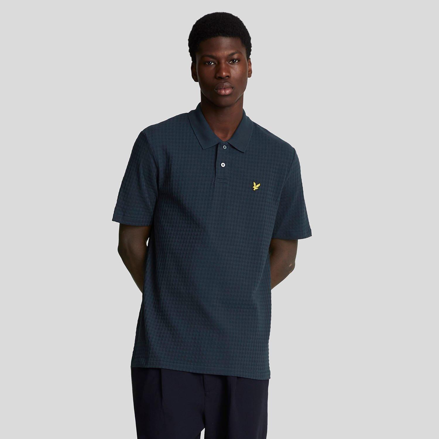 Classic collar. Short sleeves. Two button placket. Textured Argyle fabric. Embroidered Golden Eagle Logo to chest. V split hem.