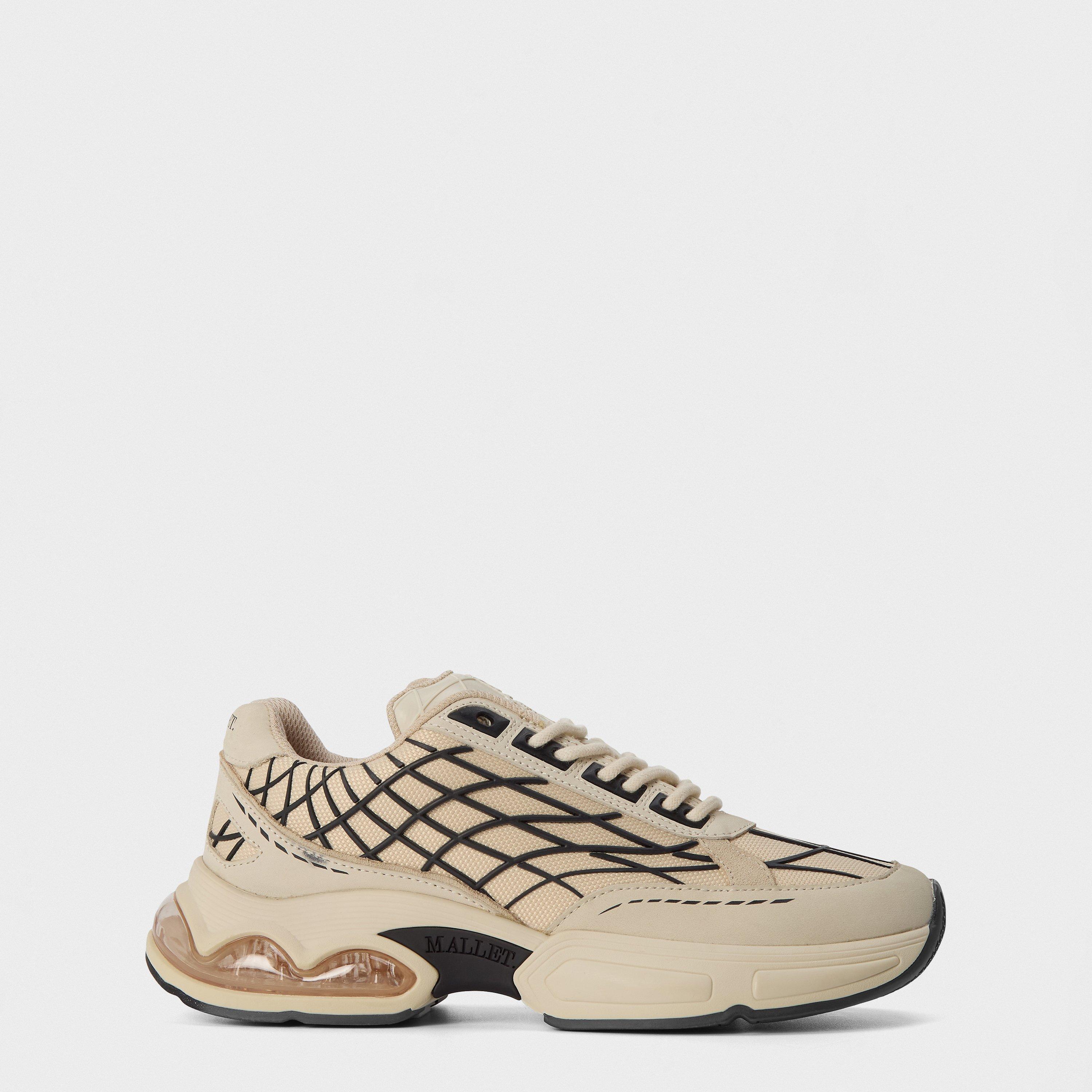 City chic and sophisticated these Neptune Trainers from Mallet make a contemporary addition to your everyday ensemble. Inspired by London's iconic Gherkin skyscraper these trainers are intricately crafted using recycled mesh underlays for comfort meaning they are not only sustainable but stylish too especially with the embroidered stitch upper panel lines reminiscent of the building's distinctive contours. The black KPU tongue and box leather heel tab add a touch of sophistication, mirroring the skyscraper's sleek facade. With a reliable lace fastening these trainers make for a secure fit and comfortable feel.The Neptune Black Stitch's aesthetic is completed by a white midsole, contrasting with a black outsole tread, midsole bubble, and gloss outsole insert, creating a dynamic visual impact, punctuated by silver-foil branding these trainers come to a distinctive finish.