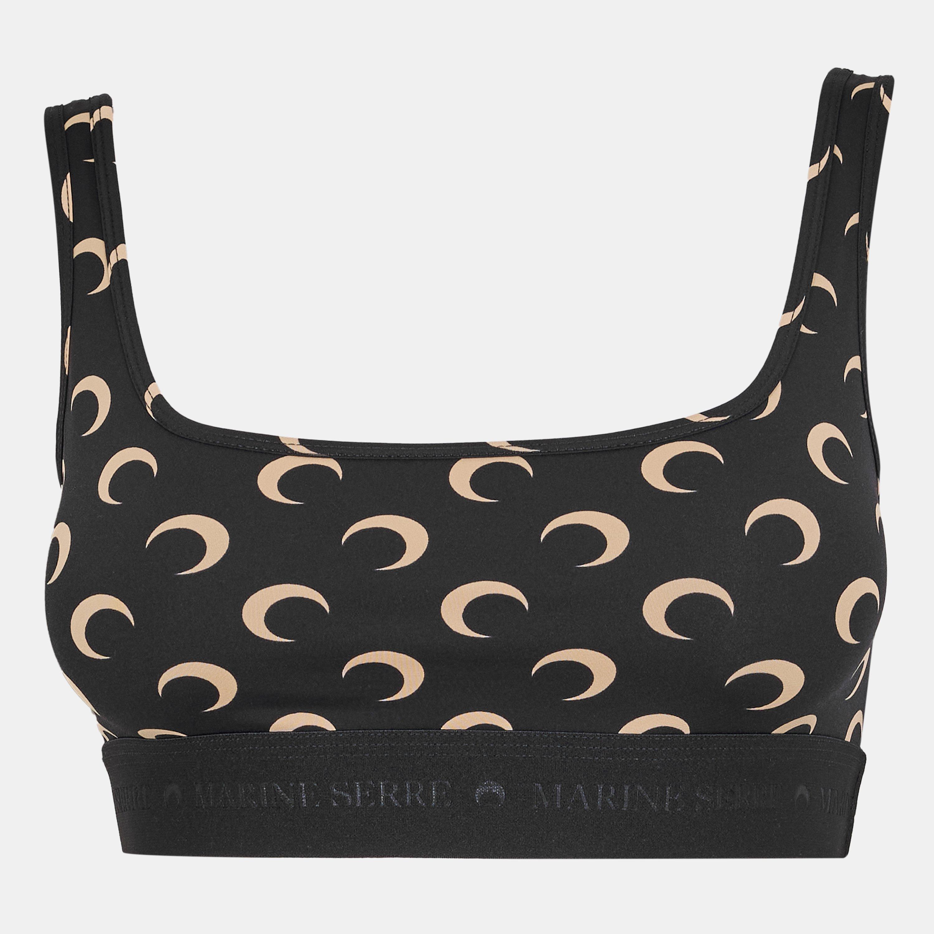 Elevate your exercise ensemble in this Marine Serre sports bra. This mystical piece is adroitly crafted from recycled sources such as polyamide, spandex and nylon for a comfortable, breathable appeal that not only adheres to the contours of your frame to achieve a flattering silhouette but also becomes a must have in your eco-conscious wardrobe. Designed in the signature crescent moon point for a magical aesthetic that exudes tranquilly, this malleable piece enhances your comfort as you focus on achieving your goals.Framed in a supportive and intricate racer back and offering an elasticated hem, embellished in the Marine Serre font for instant brand recognition this piece comes to a prestigious finish.Machine Wash to care label.