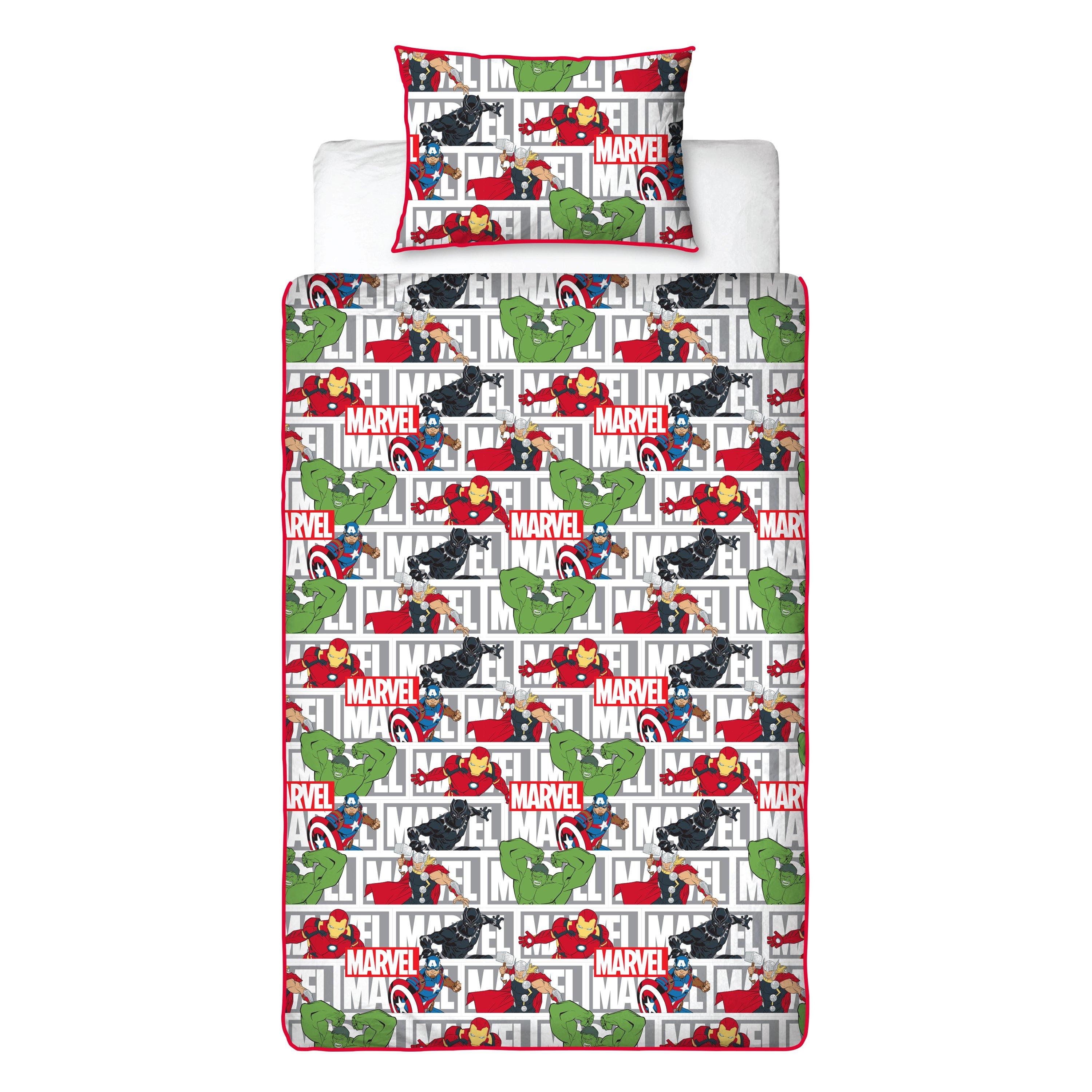 Heroic, brave and exciting, Marvel’s Avengers have been capturing young imaginations in comics and films for generations. This officially licensed Marvel Avengers bedding set is designed for single beds and includes a reversible duvet cover and pillowcase, so you can easily freshen up the look of your child’s bedroom. The front side of the duvet cover features The Hulk, Black Panther, Thor and Captain America on a repeating background of the Marvel logo, which runs on to the pillowcase. The reverse side features the Marvel and Avengers logos repeating in white on a red background. The duvet cover and pillowcase are surrounded by red piping trim. The bedding is made from recycled polycotton (52% cotton), and printed to a high standard. The duvet cover has popper fasteners so it’s easy to remove to wash and remake afterwards. The duvet cover and pillowcase are machine washable, and tumble dryer safe at a low temperature. Designed for single beds, this Marvel Avengers duvet cover measures 135 x 200cm, and the pillowcase is a standard UK size of 74 x 48cm