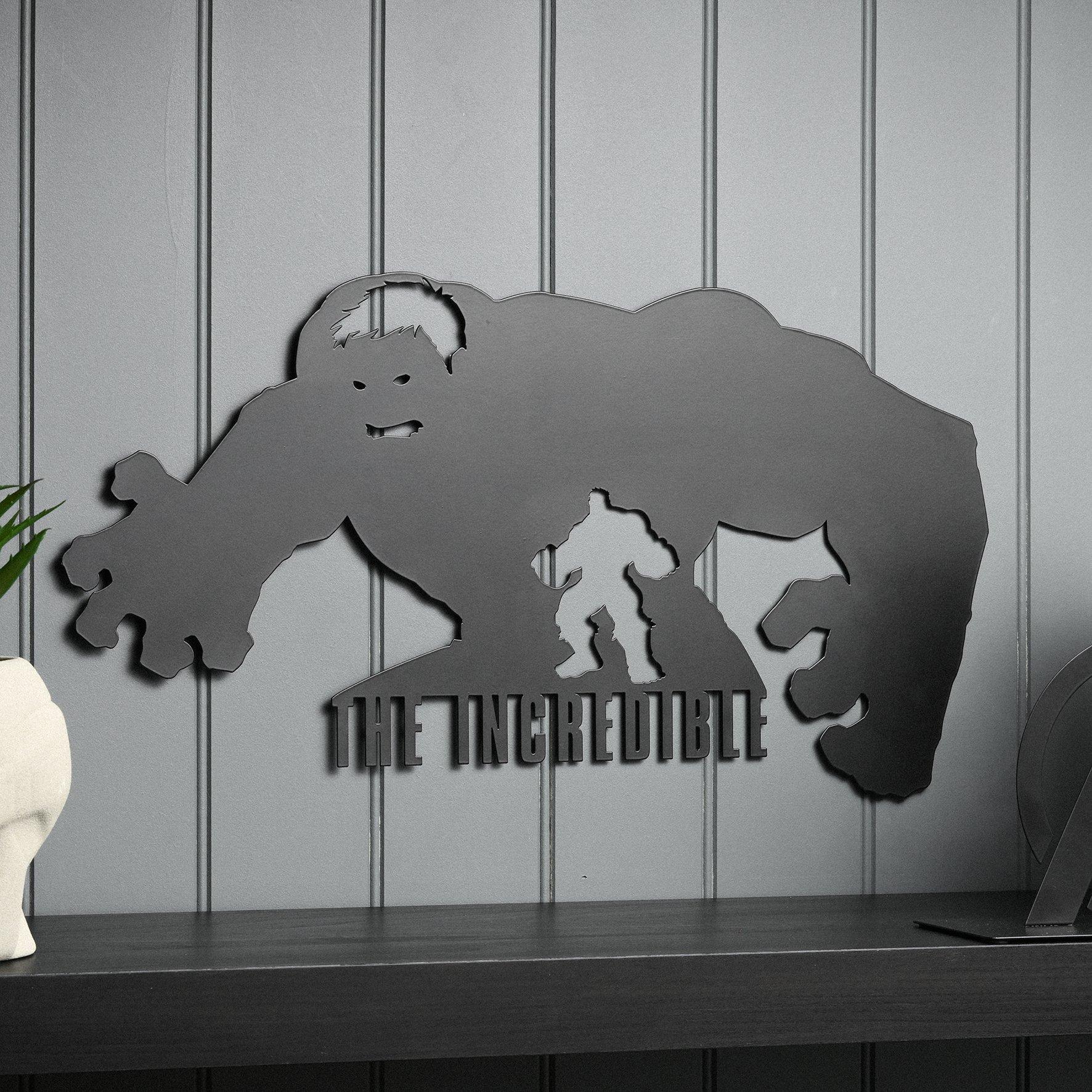 This striking metal wall plaque features a powerful silhouette of the Hulk in a dynamic, crouched pose that captures his immense strength and intensity. The bold black design is accented with cut-out detailing that highlights his fierce expression and massive form. Below him stands a smaller silhouette, symbolizing the transformation that defines the character, along with the words THE INCREDIBLE cut into the base. Dramatic and eye-catching, this piece makes a standout addition to any Marvel fan's space.