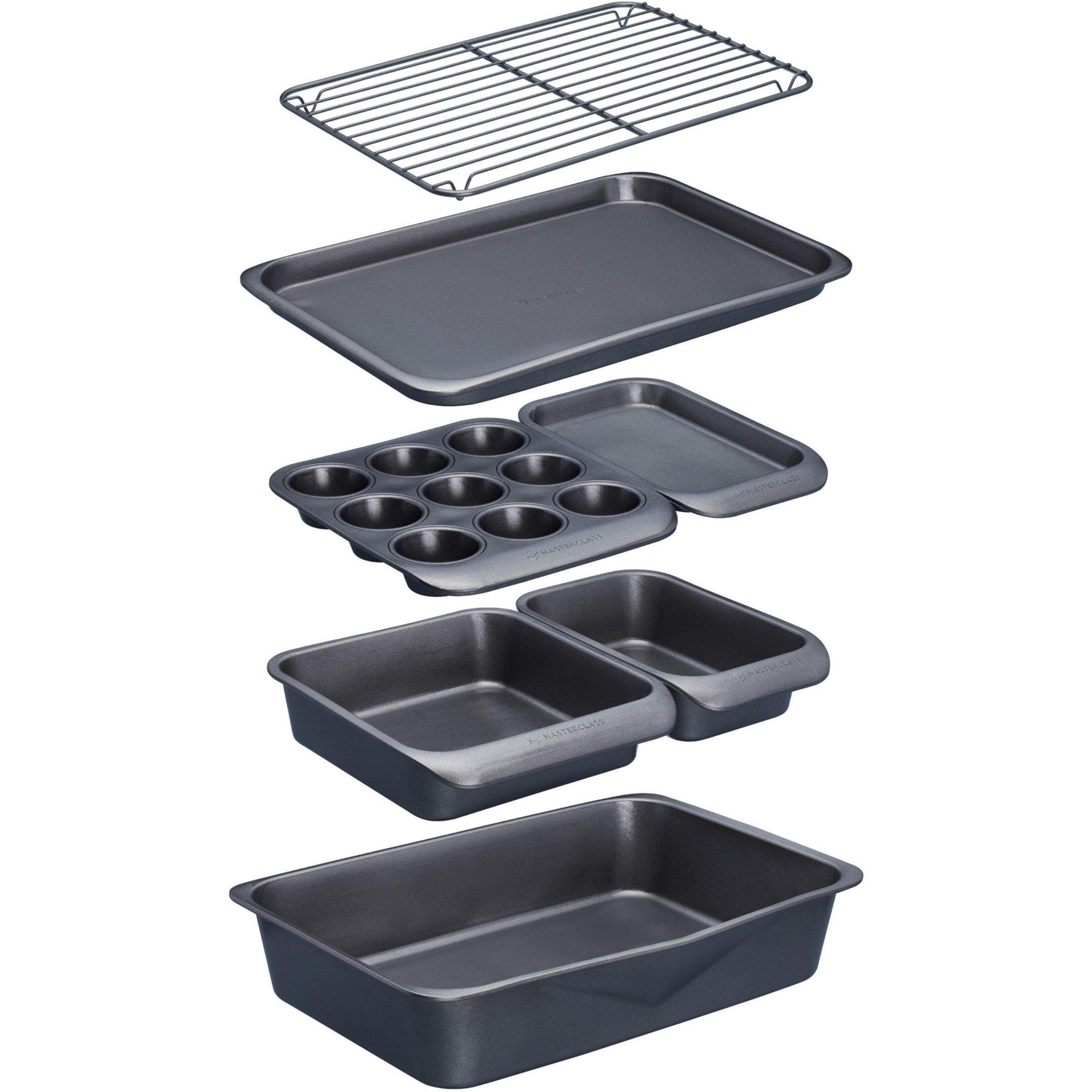 Whether you're an experienced baker or a complete beginner, you don't need mountains of storage space to achieve baking excellence. Reclaim your kitchen space with this professional seven-piece stacking bakeware set. The entire set nests into the space of the largest tin, freeing up valuable cupboard room so even those with small kitchens can bake to their heart's content. It contains all the essentials you need, backed up by MasterClass's exceptional quality standards. Each piece is made of heavy-gauge carbon steel, renowned for its strength, durability and heat distribution properties. All are finished with a durable, BPA-free non-stick coating, too, for fuss-free food release and fast cleaning. Expect years of excellent performance and consistent bakes, whatever you're cooking: juicy roast dinners, healthy grilled fish, sweet banana bread, crunchy rocky roads, decadent chocolate chip cookies, classic blueberry muffins, the list is endless. Built to last, this baking set is covered by the MasterClass 25-year guarantee.